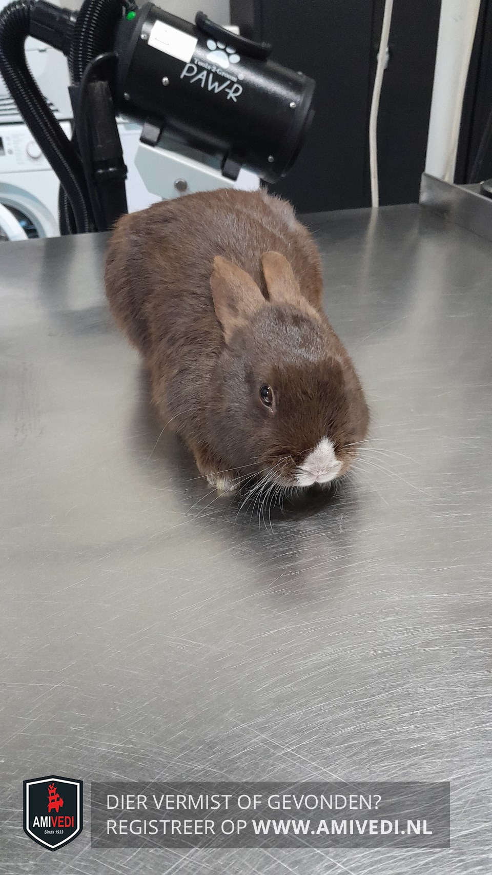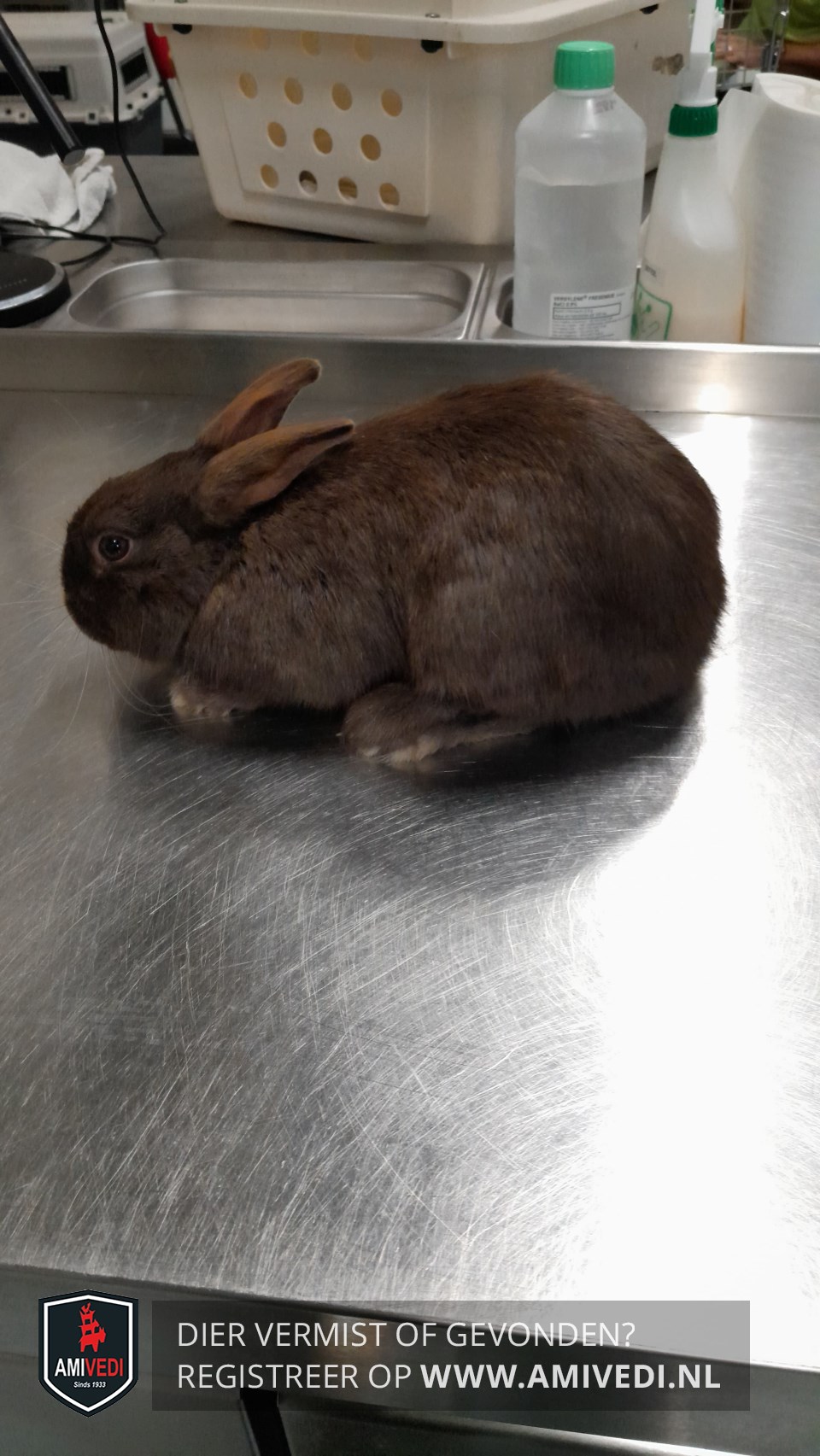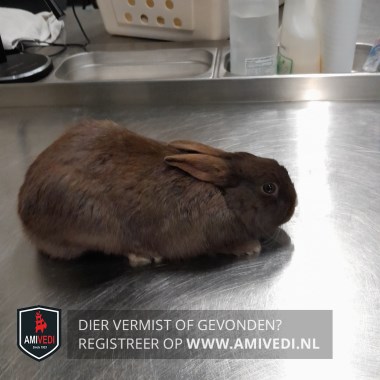 | Signalement | Bruin konijn, wit driehoekje op de snoet, witte tenen. |