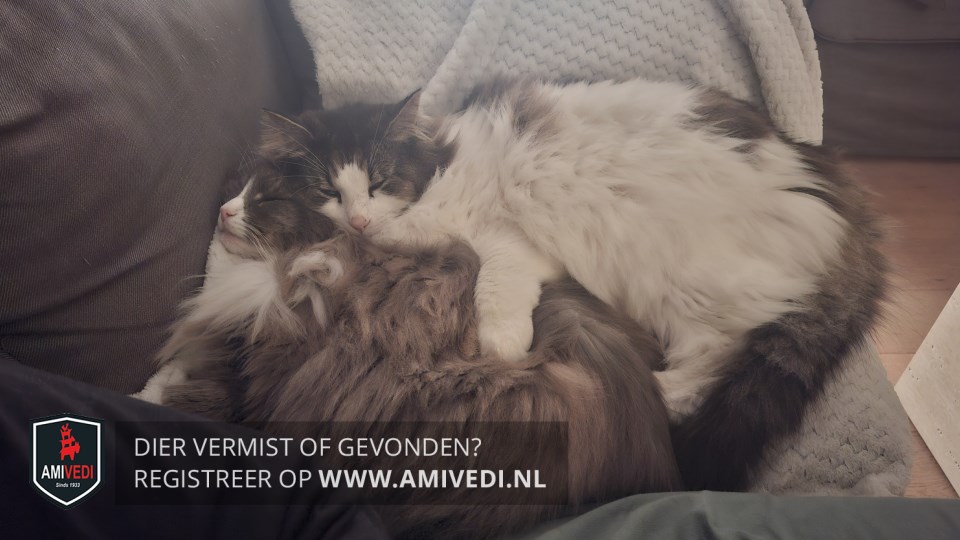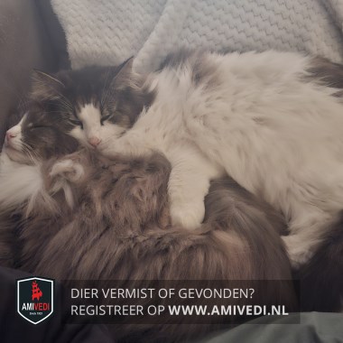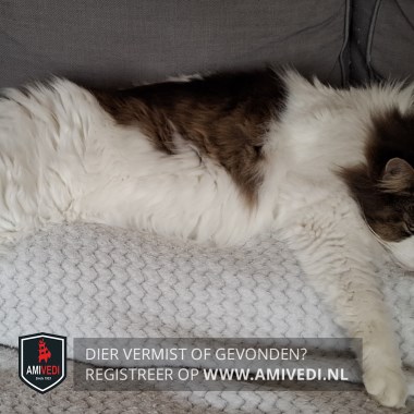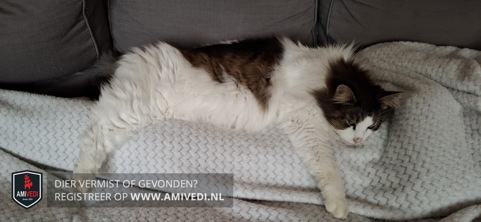| Signalement | Noorse Boskat. Bruin rond oren, boven ogen en achterhoofd. Bruin zadel op rug. Bruin/grijze staart. |