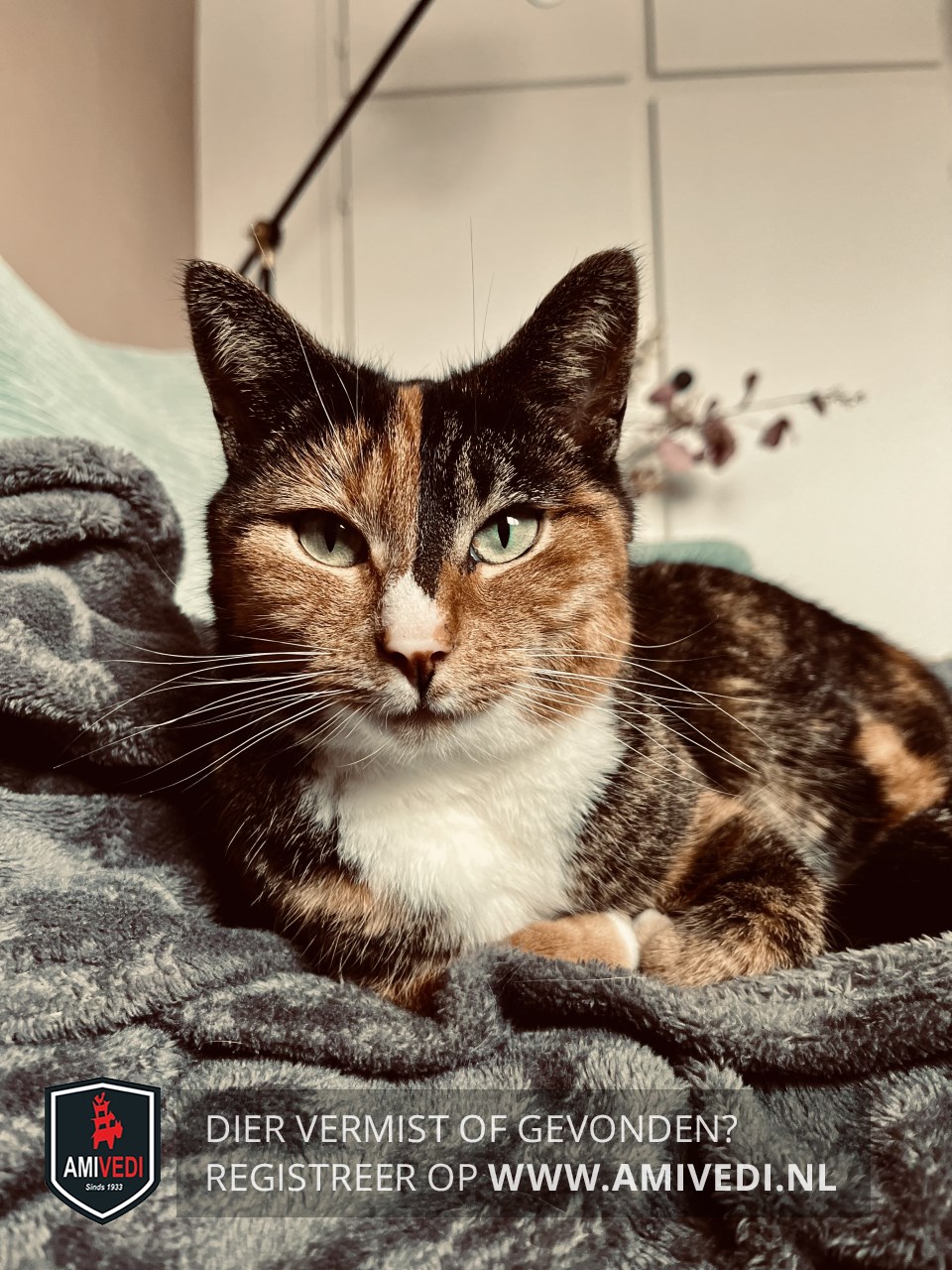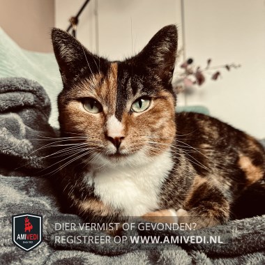 | Signalement | Roodbruin/zwart gemêleerde schildpadpoes. Zwarte streep over de linker kant van de neus, wit vlekje op de neuspunt, beetje wit rond het bekje, witte hals en bef. |