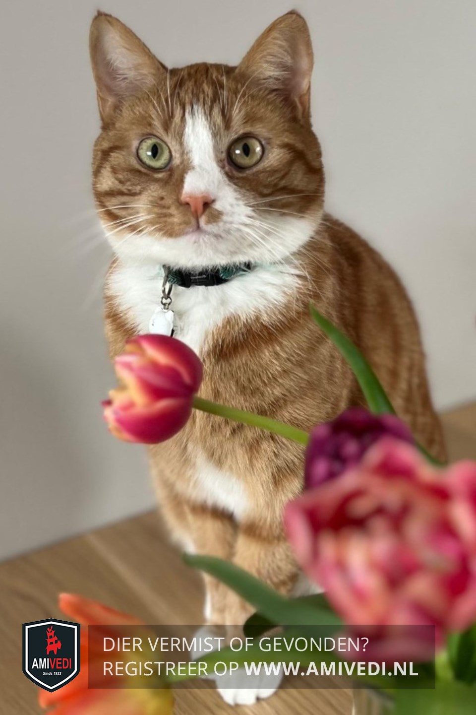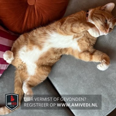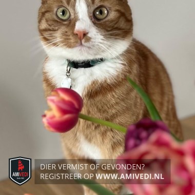 | Signalement | Cypers rood/oranje gestreept, witte bles, bef, kin, borst, voetjes. |