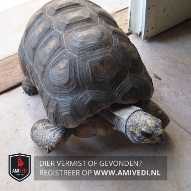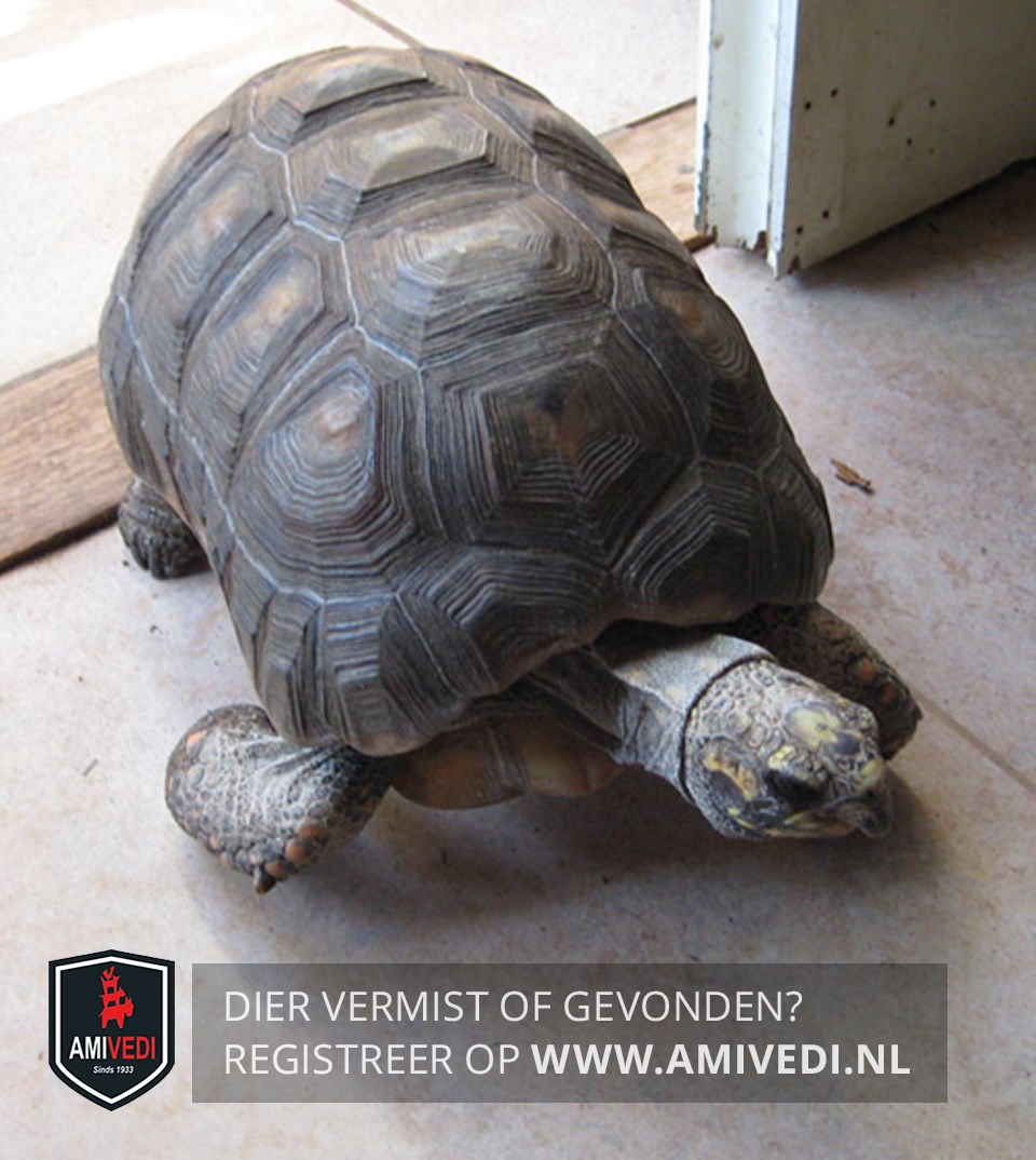 | Signalement | Kolenbranderschildpad/ roodvoetschildpad. Een donkerbruin/zwart, langwerpig rugschild met een lichte vlek in het midden van elke plaat. Paar oranje schubjes aan de voorpoten. ± 50cm lang. |