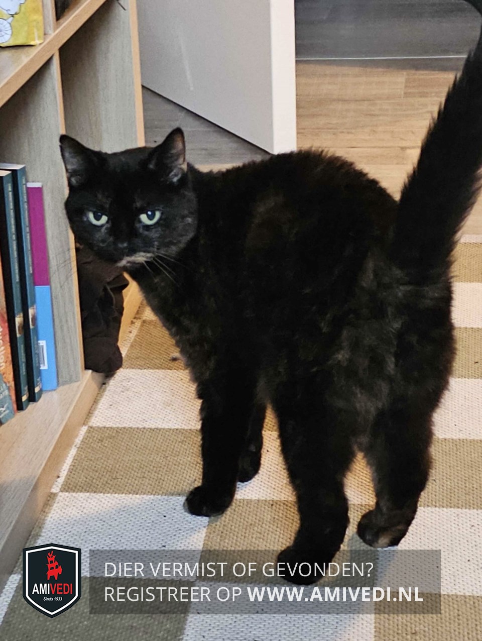| Signalement | Zwart met rood vlekje onder neusje. Hier en daar wat rood in het zwarte vachtje. |