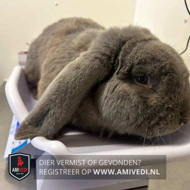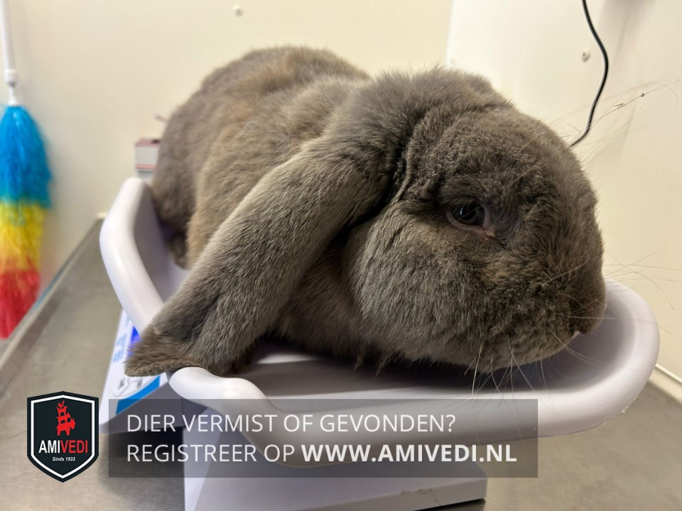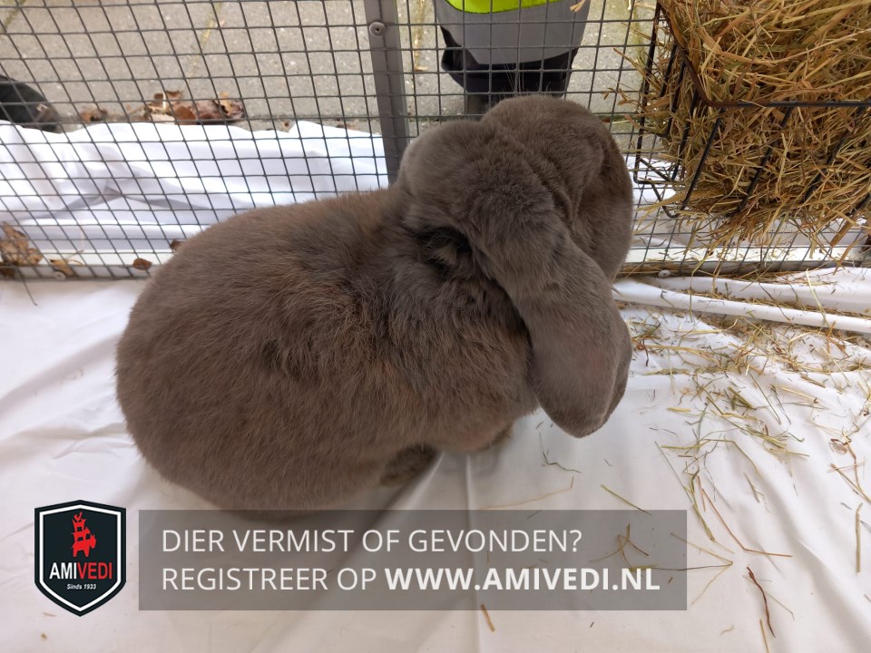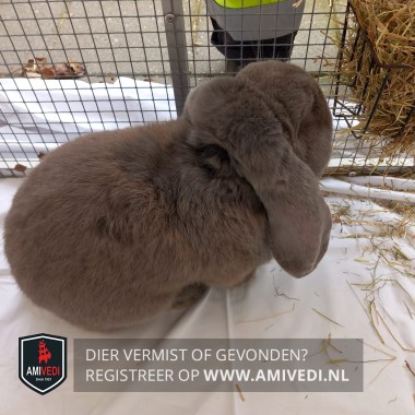 | Signalement | Ongecastreerde ram hangoor konijn. Egaal grijs/blauw met bruine gloed. Groot postuur. Licht grijze snorharen. Bruine ogen. |