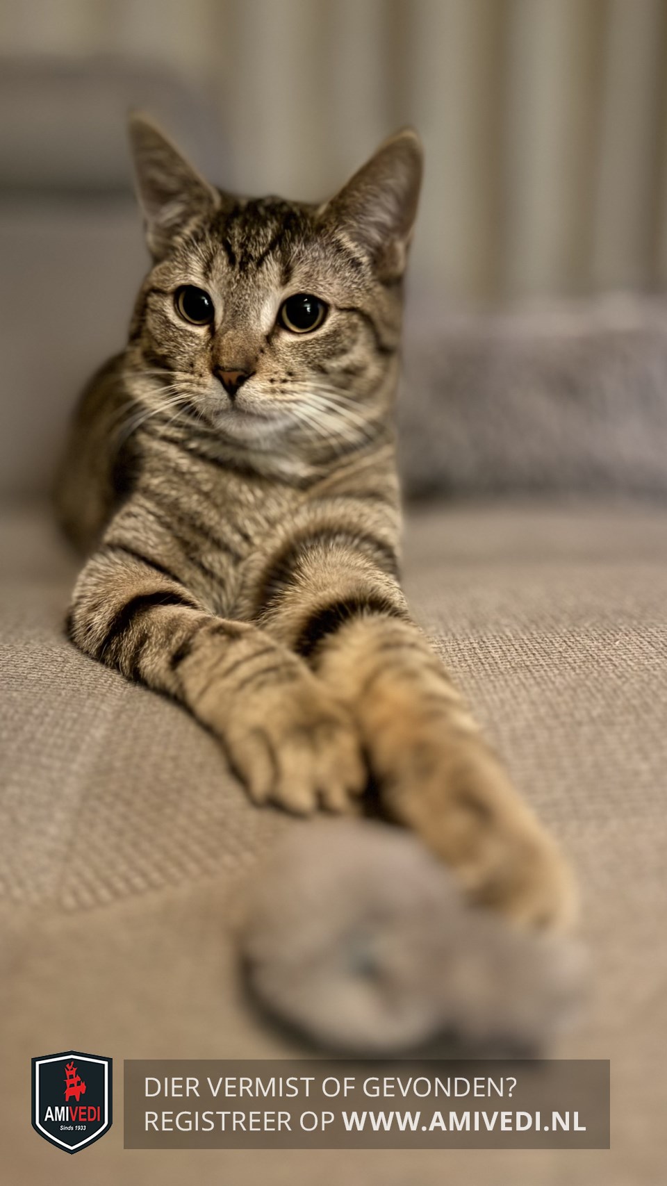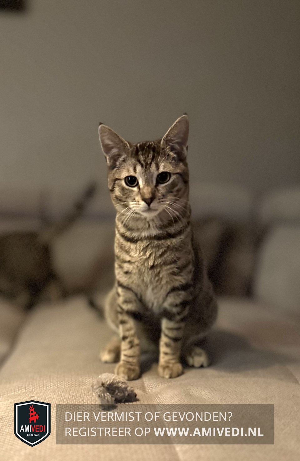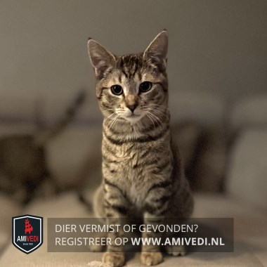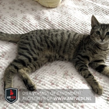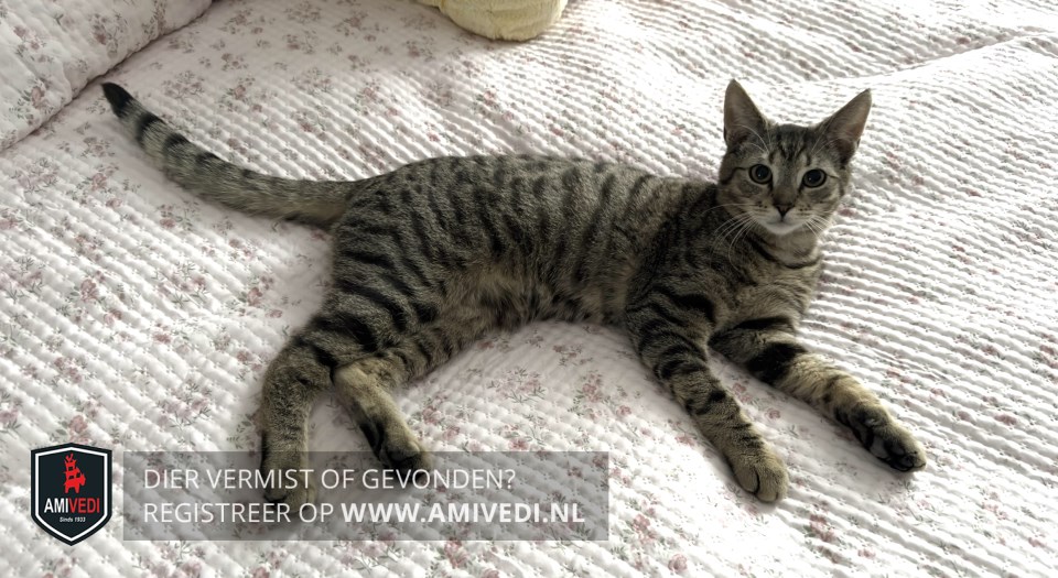 | Signalement | Cypers bruin/zwart/grijs gestreept met wit snoetje en kin, beetje wit op de bef, zwarte staartpunt. |