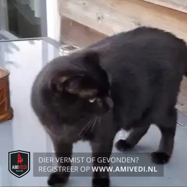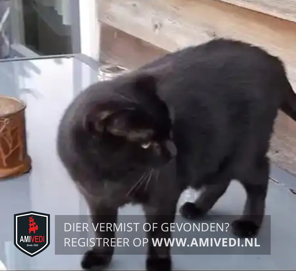 | Signalement | Volledig zwarte kat met een paar grijze haren op haar oor. |