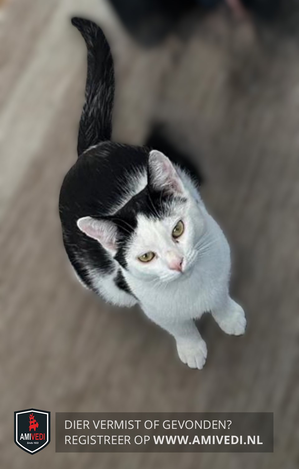 | Signalement | Zwart petje op de kop, witte 'halsband' met daarachter rug en flanken grotendeels zwart. Wit stukje net voor de aanzet van de ook zwarte staart. Vanaf boven de ogen verder wit kopje, kin, nek, bef, borst, buik en poten. Aan de rechterachterpoot een zwart vlak net boven de knie |