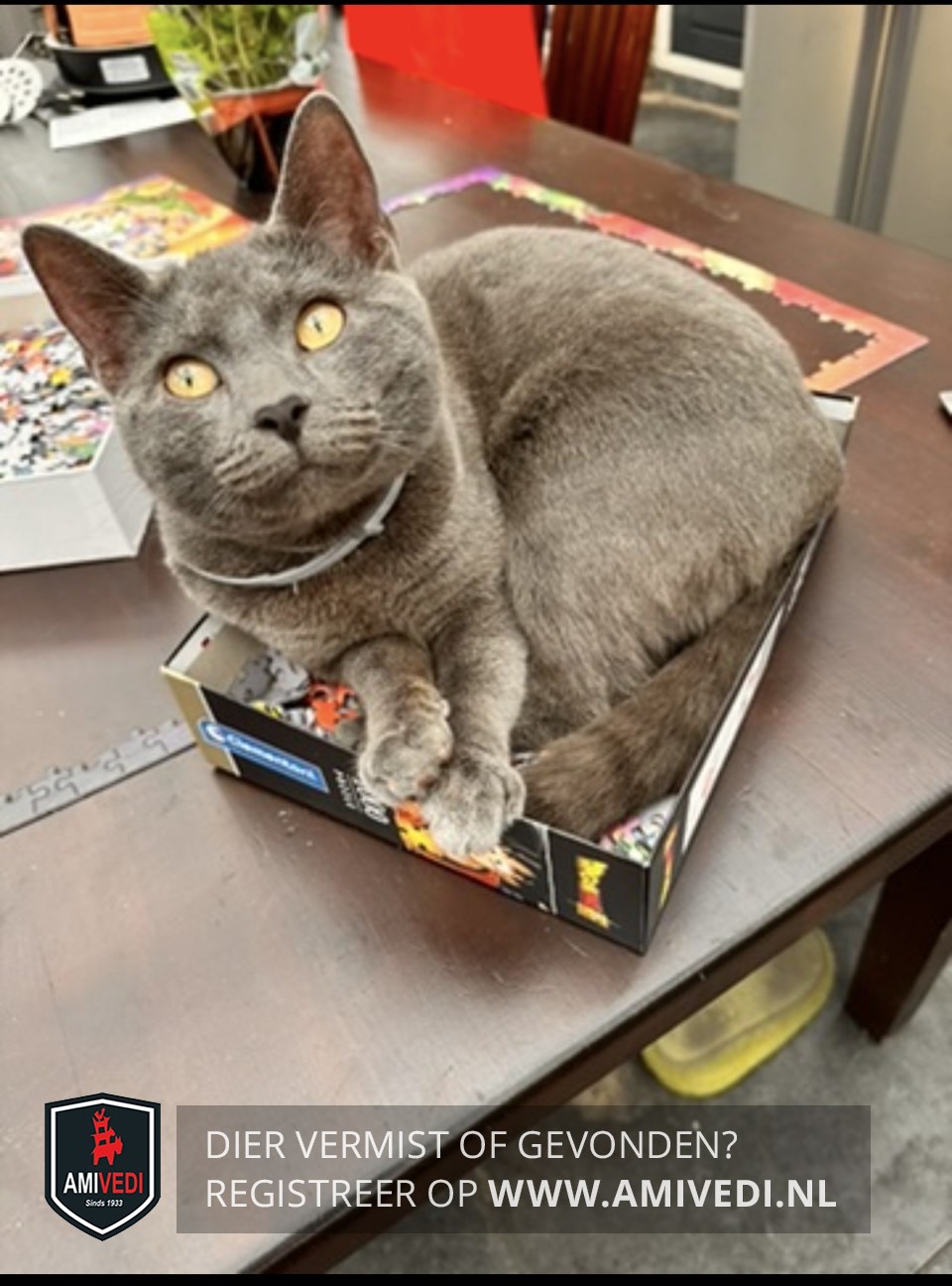| Signalement | Grijze kat met een licht geringde staart. |