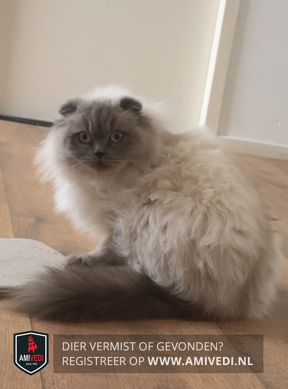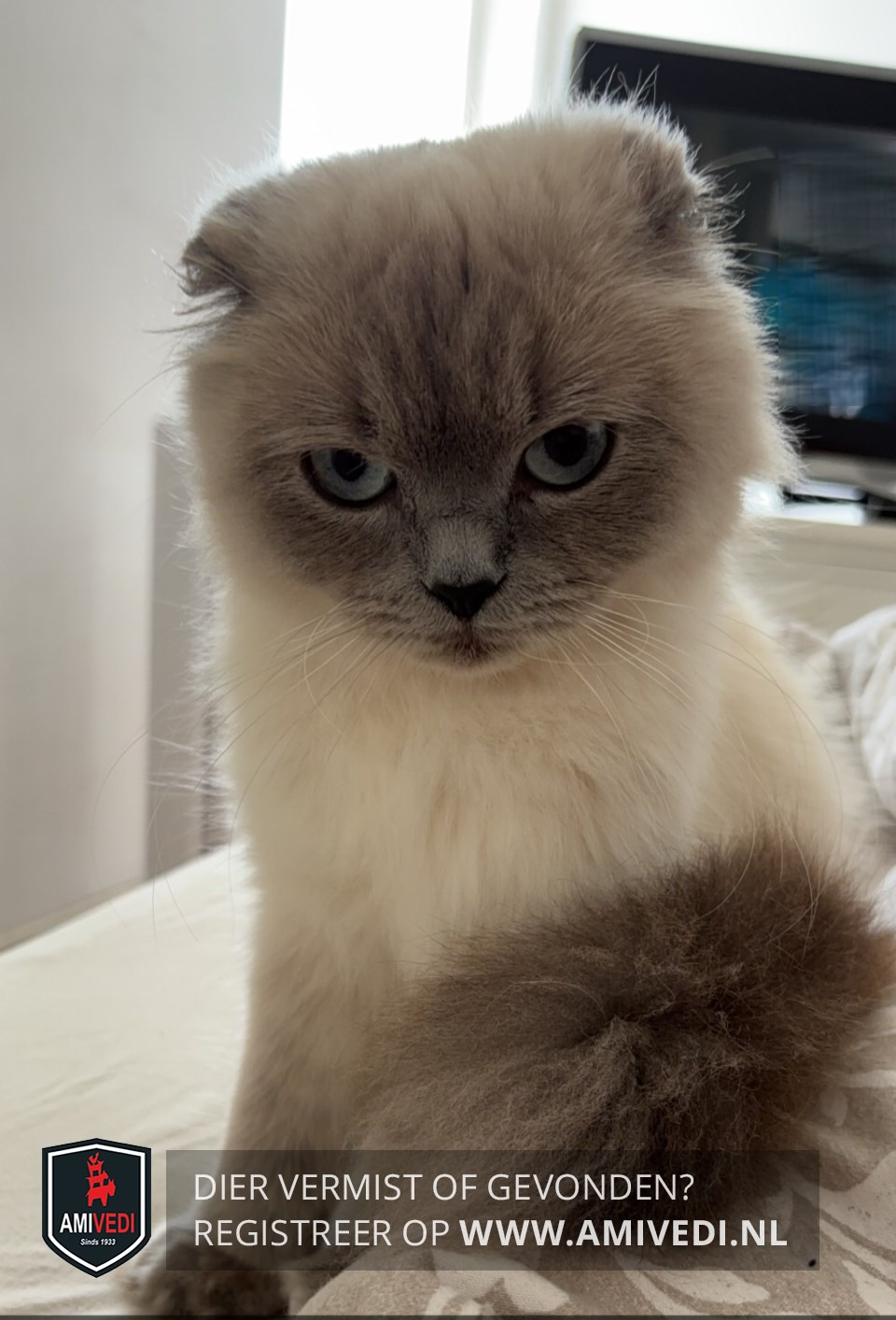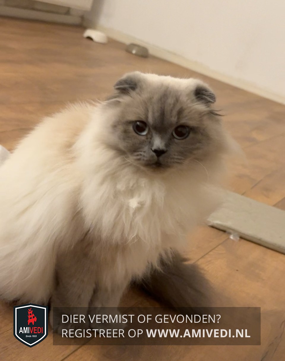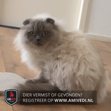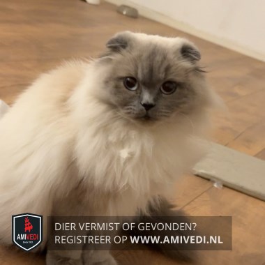 | Signalement | Scottisch Fold X met Brits Korthaar, wit met grijs. Grijze gevouwen oortjes, grijze snuit, grijze voetjes en grijze staart. Helblauwe ogen. Nous krijgt speciale voeding! |