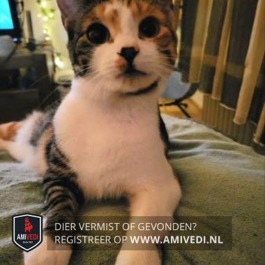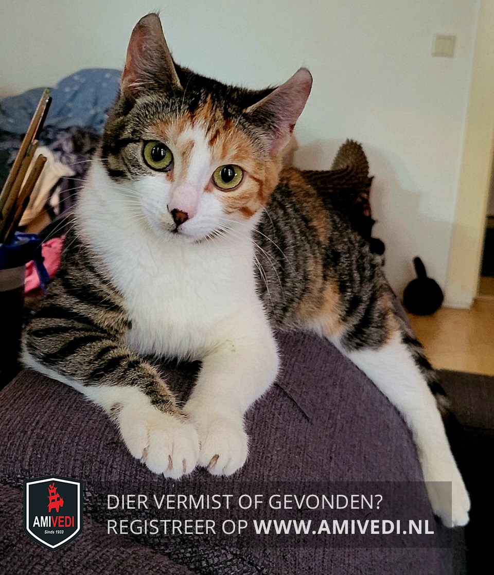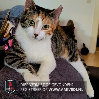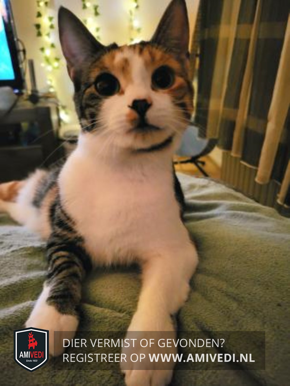 | Signalement | Cypers grijs/zwart/oranje gestreept met wit tussen haar ogen. Witte wangen, witte borst. Linker voorpoot is wit. Rechter voorpoot een wit voetje wat aan de zijkant doorloopt naar de elleboog. In ieder geval is het linker achterpoot ook wit. |