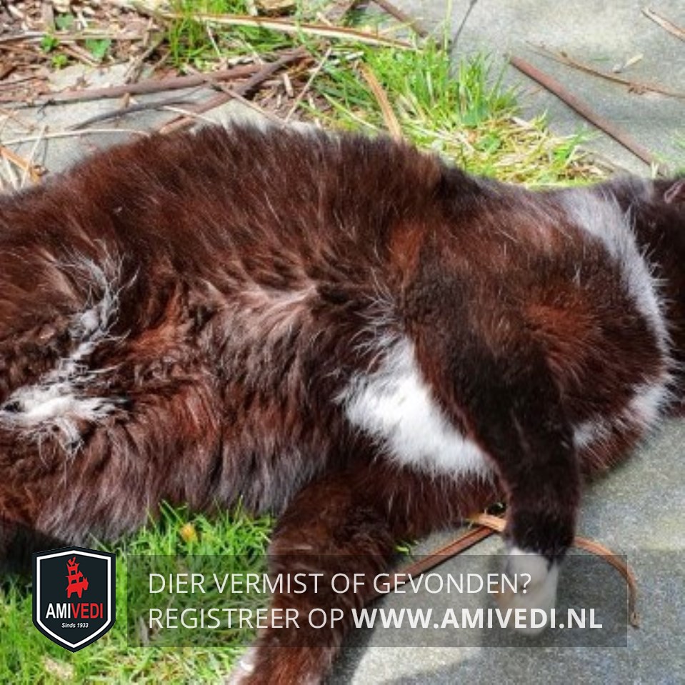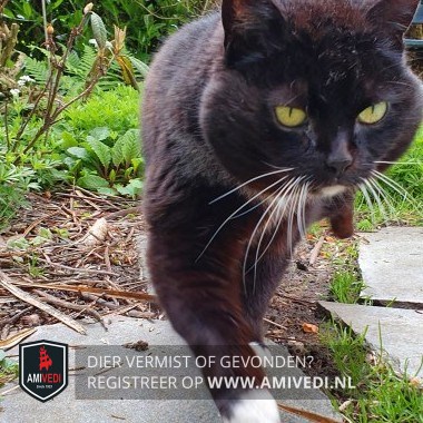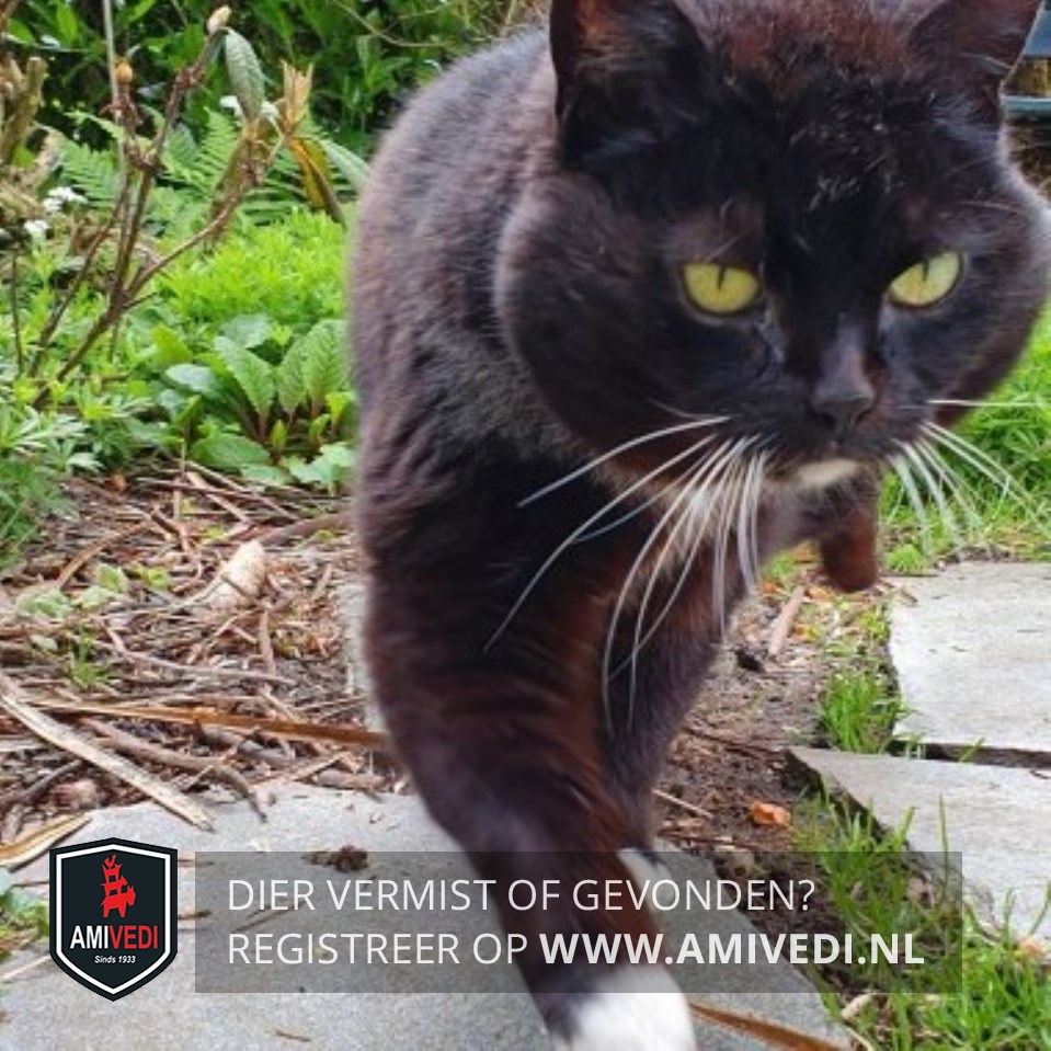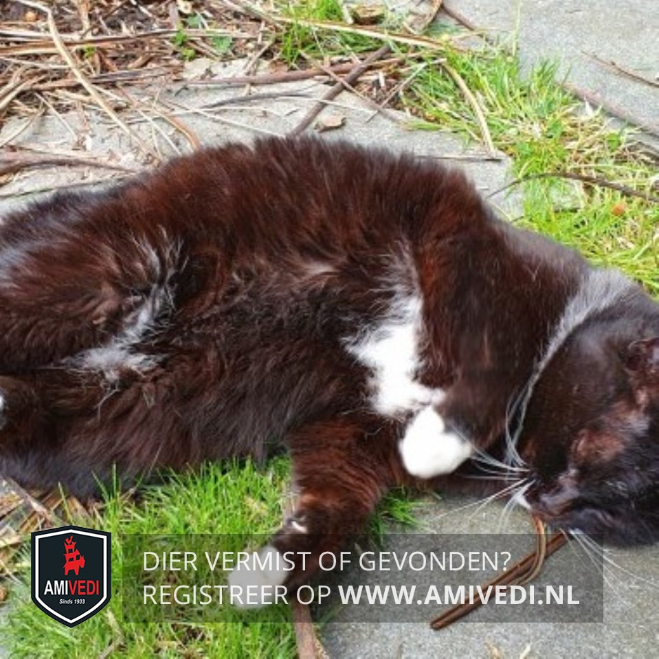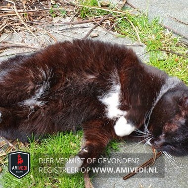 | Signalement | Zwart /bruin met een witte kraag, witte borst, witte plek onder de bek. Voorpoten hebben witte sokken. Doof, schuw, buitenkat. |