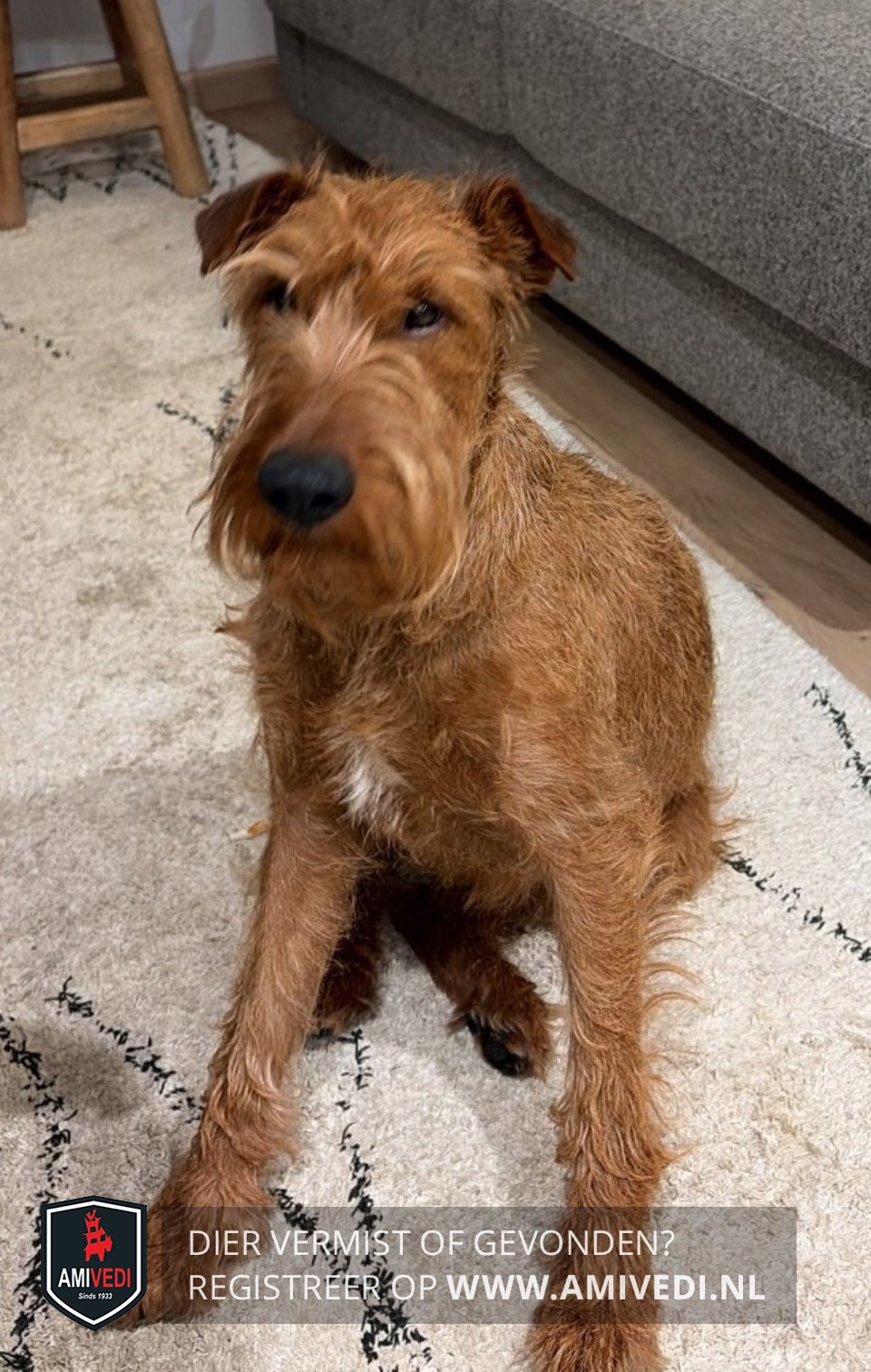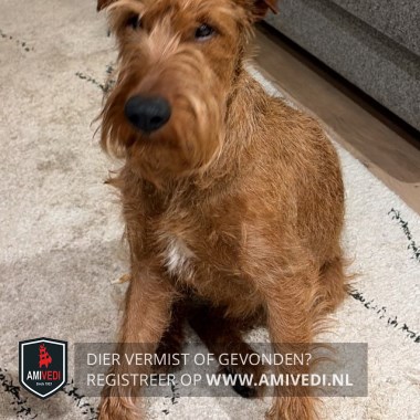| Signalement | Terrier bruine krullenvacht, klein wit vlekje op borst. |