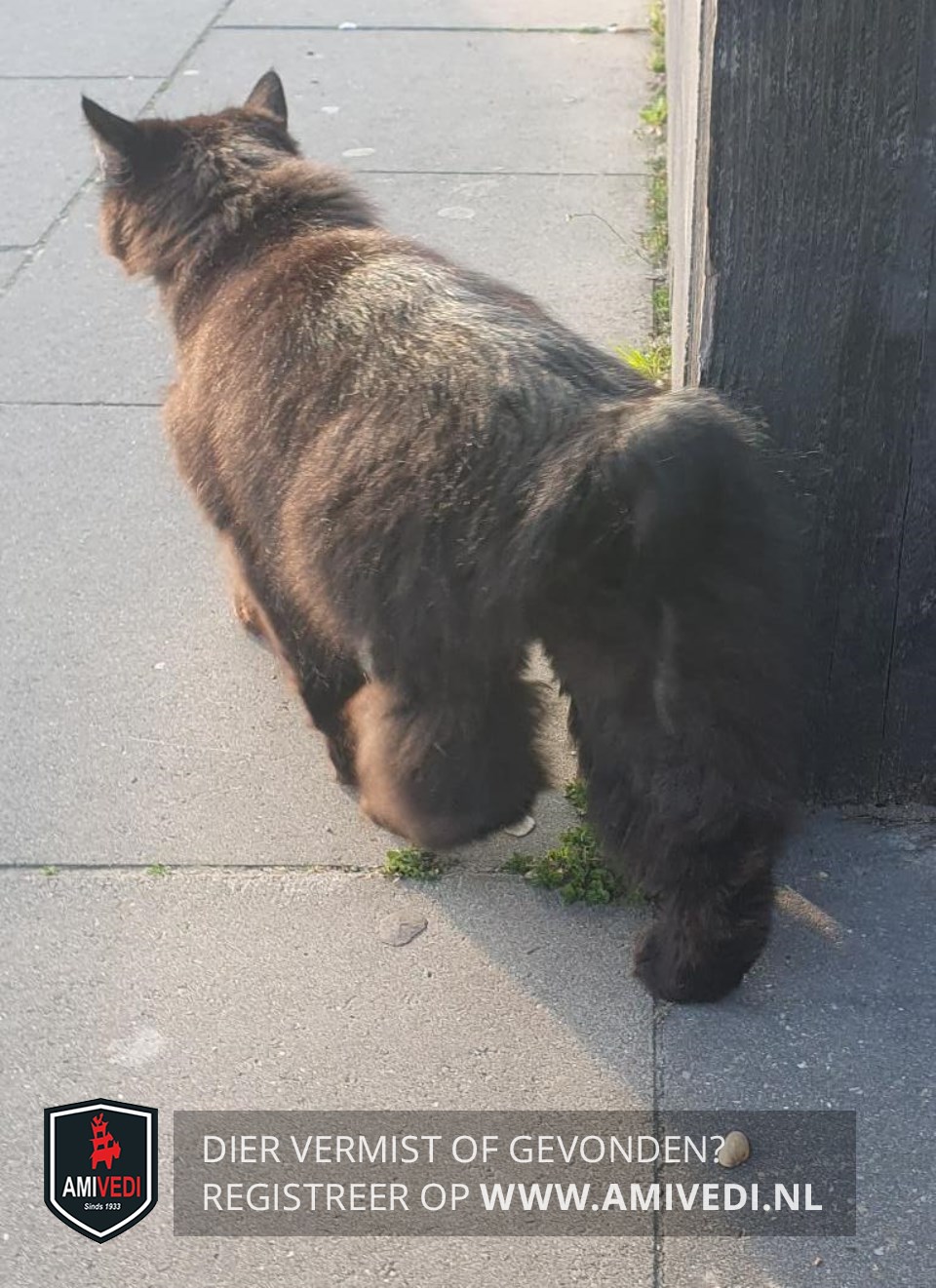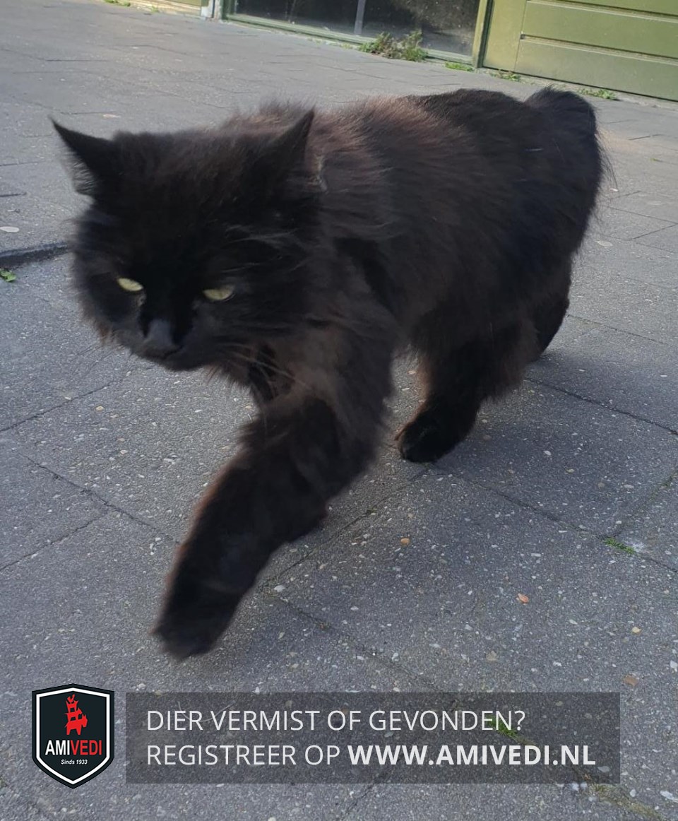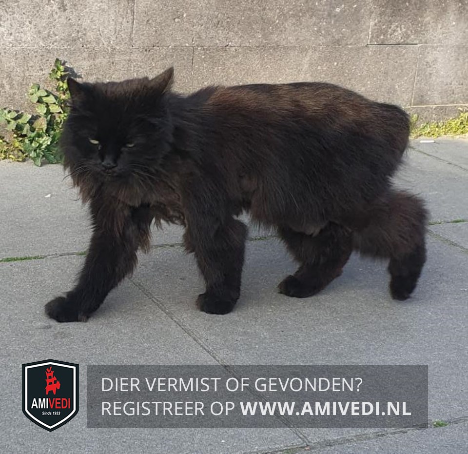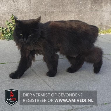 | Signalement | Zwarte kat met deels lang haar en stomp staartje. |