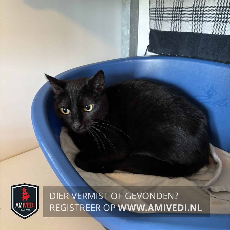 | Signalement | Volledig zwarte kortharige poes met witte snorharen en geel/groenige ogen. |
