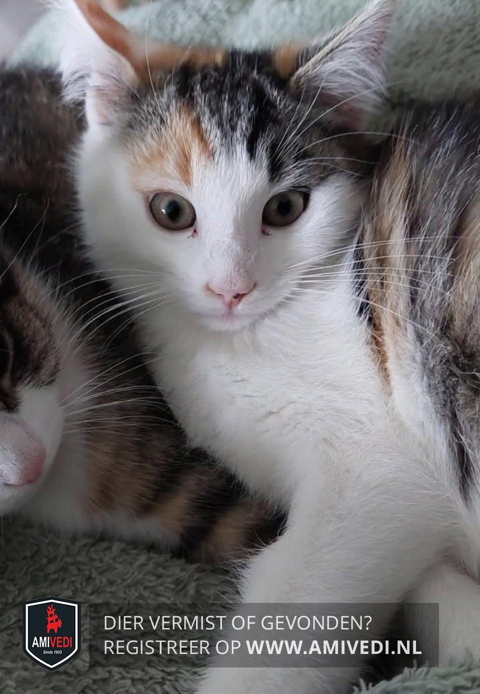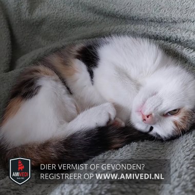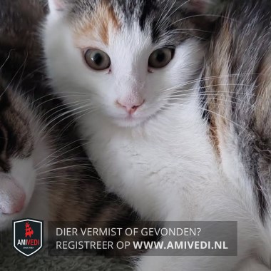 | Signalement | Witte neus wangen nek buik en pootjes, bovenop haar kopje rug en staart rood zwart gecyperde vlekken. |