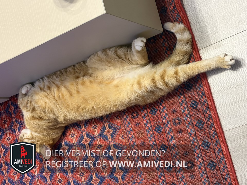 | Signalement | Cypers rood gestreept met witte accenten: wit befje, witte teentjes/voetjes aan de poten. De staart is naar het uiteinde toe meer licht geringd. |