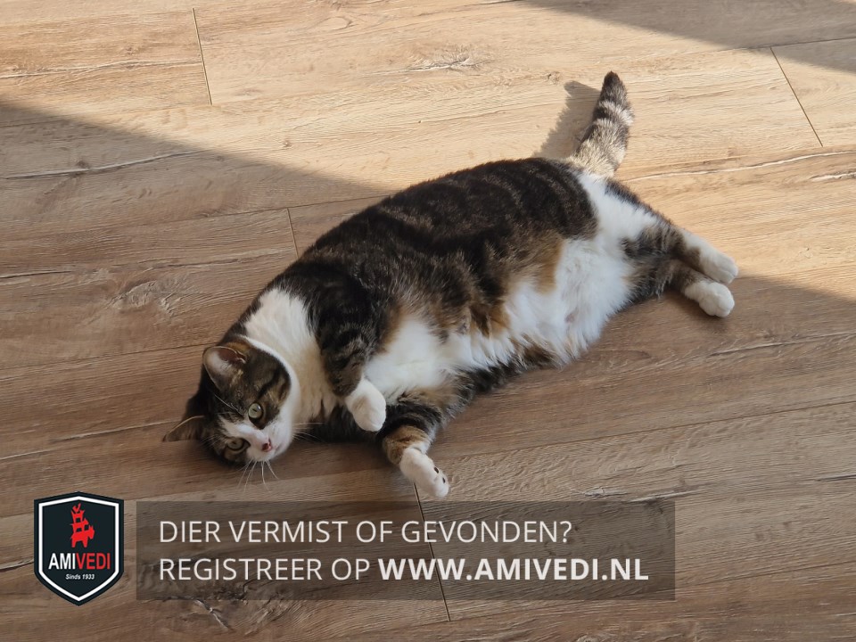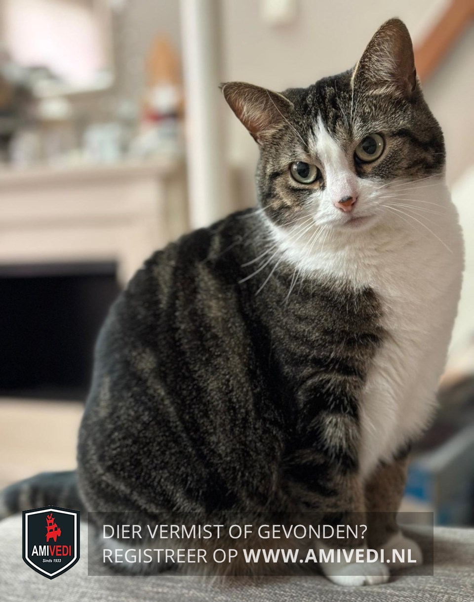 | Signalement | Cypers bruin/zwart met wit. Cypers bruin/zwart bovenop de kop, oren, zijkant kop en tot onder beide ogen. Vanaf voorhoofd wit over de neusbrug, rondom de neus en mond. Midden op de roze neus een klein zwart vlekje. Witte kin, bef, borst en buik. Heeft een hangbuikje. Cypers bruin/zwarte nek, rug, zijflanken en staart. Beide voorpoten cypers bruin/zwart met witte sokjes. Beide achterpoten cypers bruin/zwart met witte sokjes, bij linker achterpoot loopt het witte sokje aan de zijkant iets verder omhoog. |