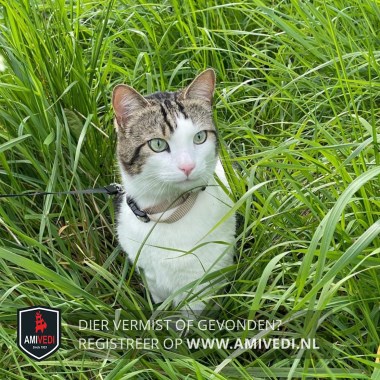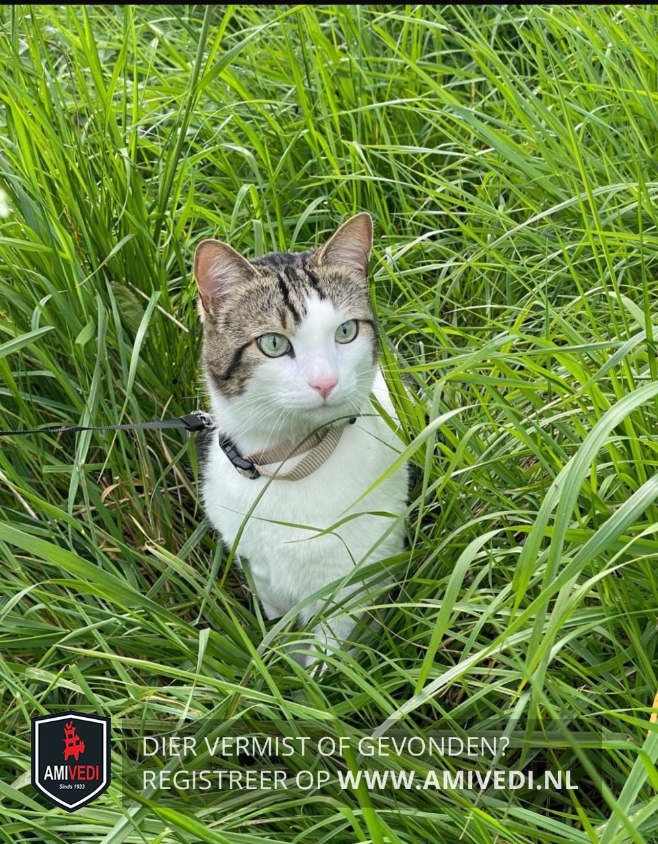 | Signalement | Op de kop en bij de oren gestreept bruin grijs, witte wangen, witte bef, groene ogen, witte poten voor. |