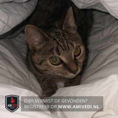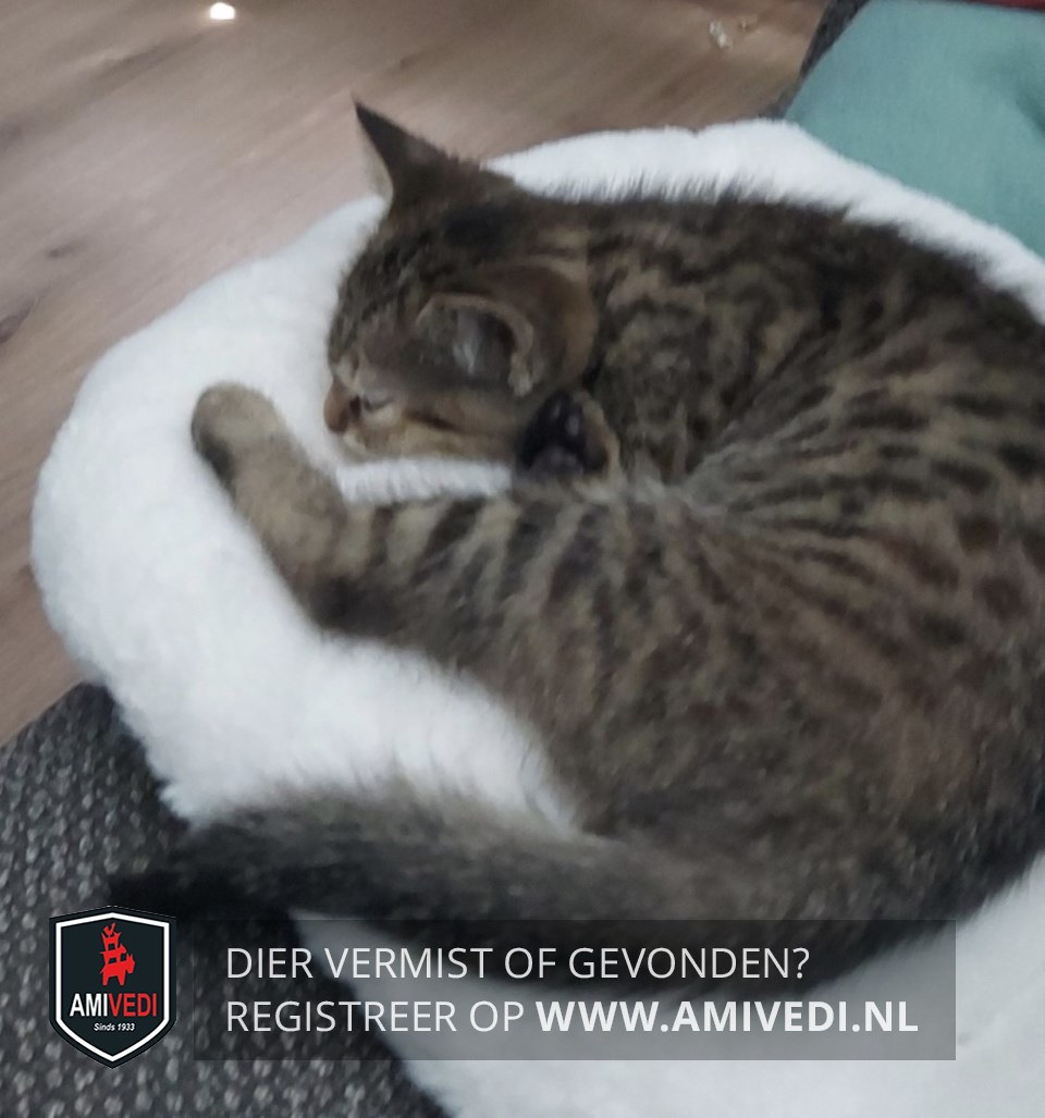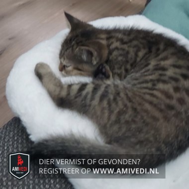 | Signalement | Cypers grijs/zwart gestreepte kat met opvallende vlekjes op haar rug. Is buiten niet gewend. |