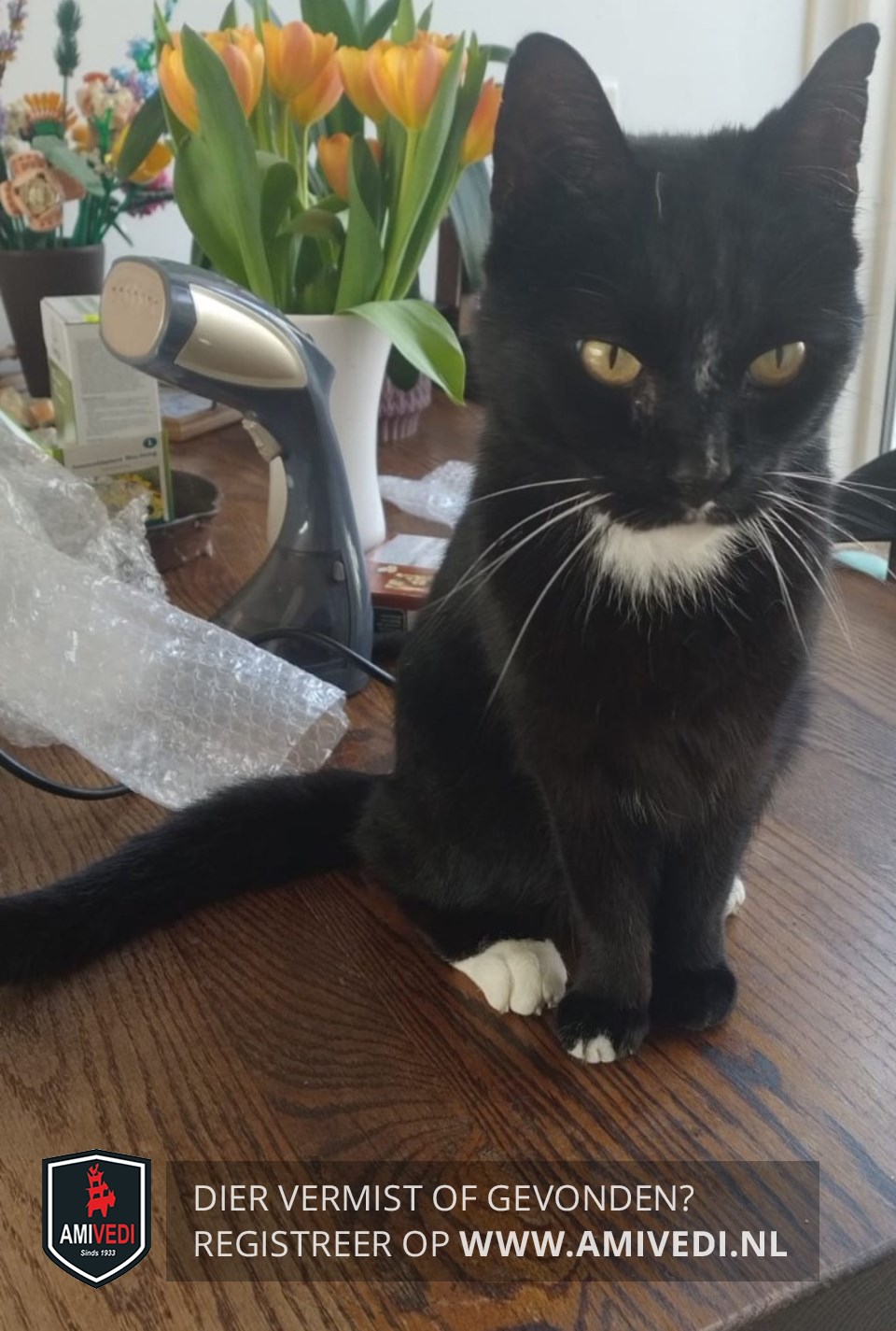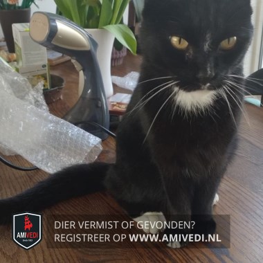 | Signalement | Zwart/witte kat met een witte kin en wit op zijn borst. Aan het rechter voorpoot witte tenen en aan de achterpoten meer wit. |