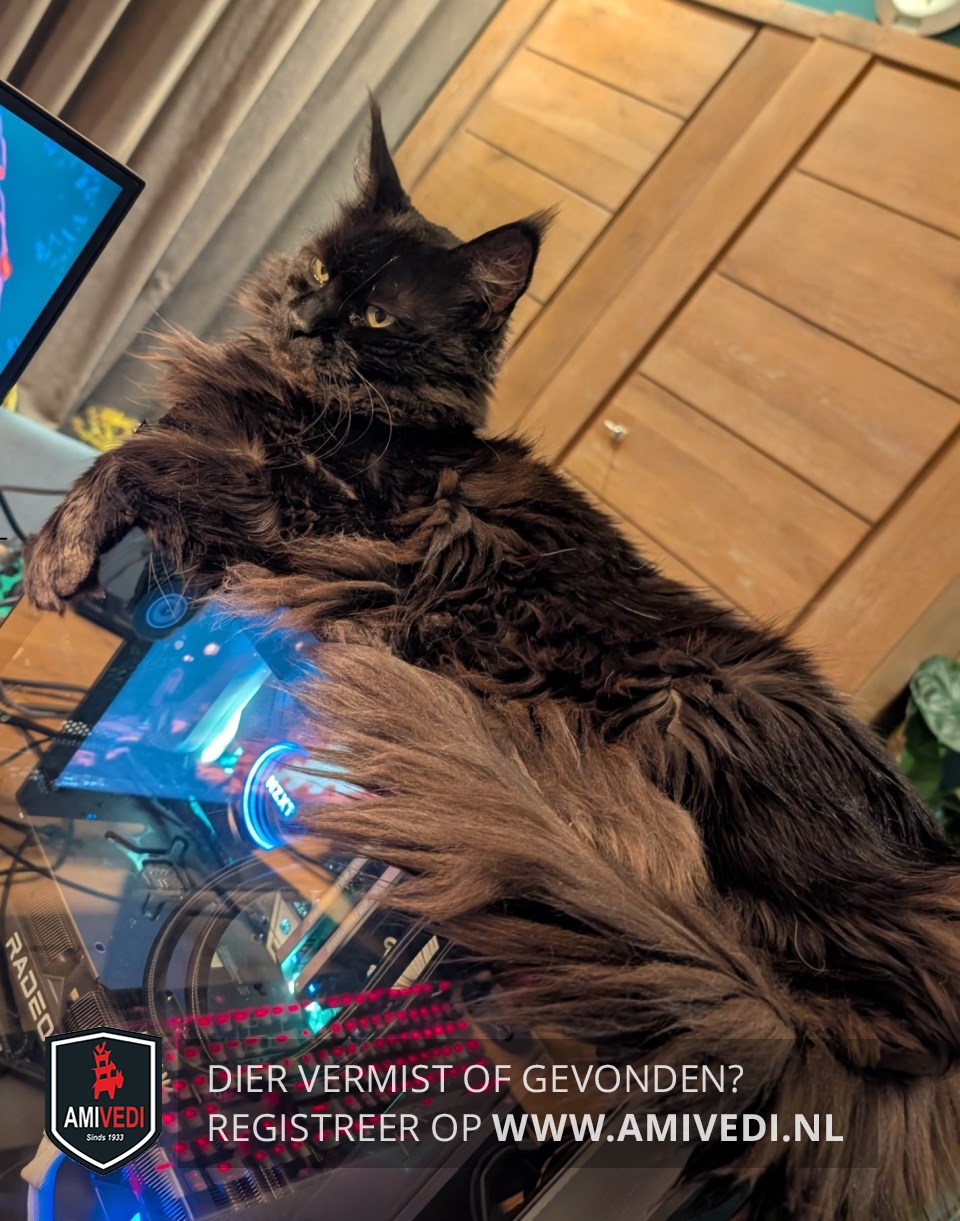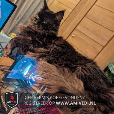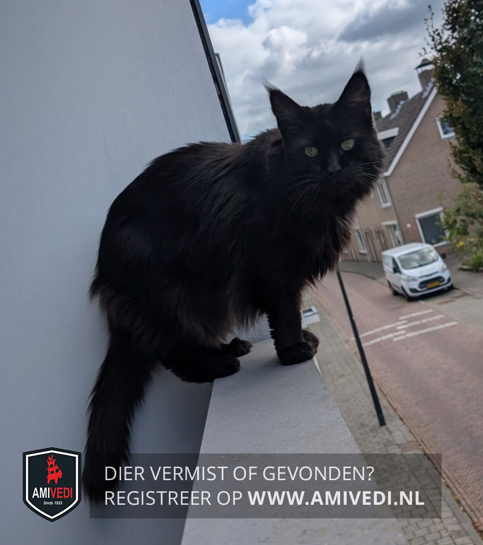 | Signalement | Maine Coon kater, langharig volledig zwart met pluimpjes aan de oren. Heeft een hangbuikje en licht dementerend. |