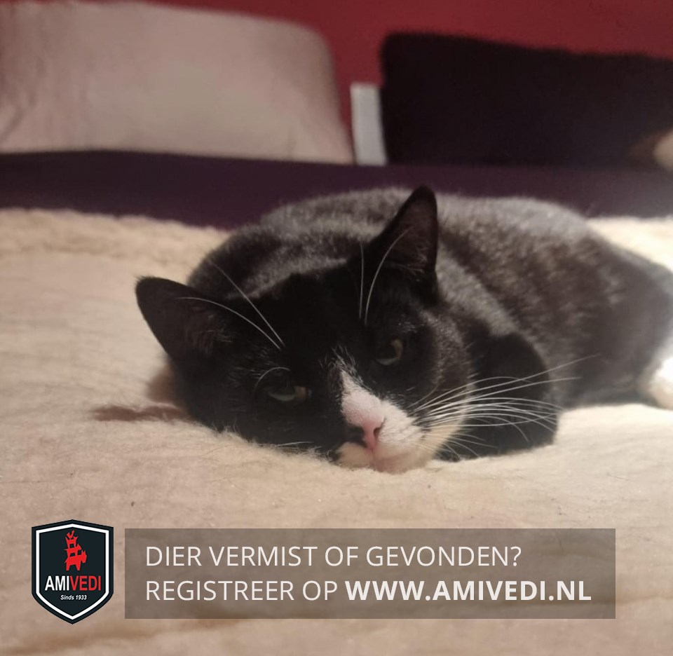 | Signalement | Zwart bovenop de kop, voorhoofd en rondom beide ogen. Een omgekeerde witte V-vorm tussen de ogen tot en met de kin. Witte vlak raakt weerszijden van de mond. Rechts en links van deze witte vlak is het zwart. Neusje is links roze en rechts zwart. Witte bef en borst. Zwart pootjes, witte voetjes |