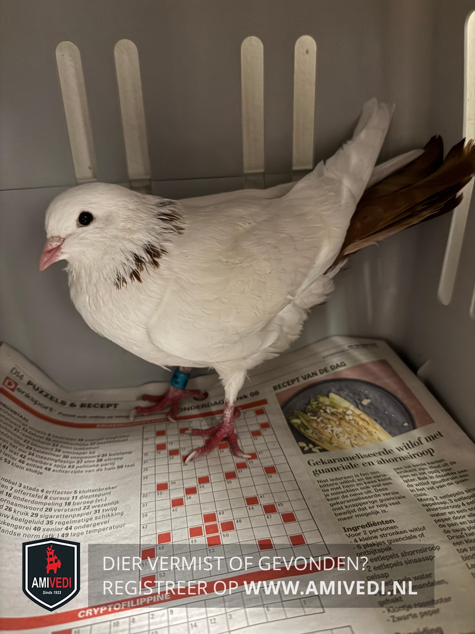 | Signalement | Sierduif in voornamelijk wit met bruin ' halsbandje' |
