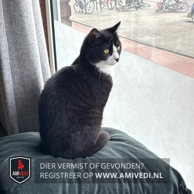 | Signalement | Egaal zwarte kat/poes met een witte bles, snuit en een zwarte stip op de neus. Volle witte bef en borst, als je goed kijkt lijkt het of hij zwart/donkergrijs gestreept is. |