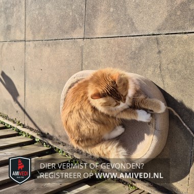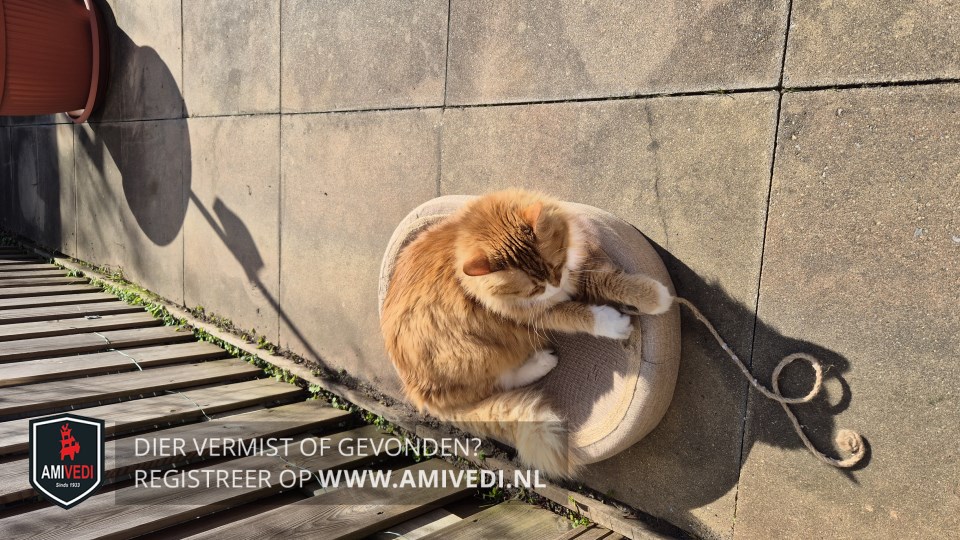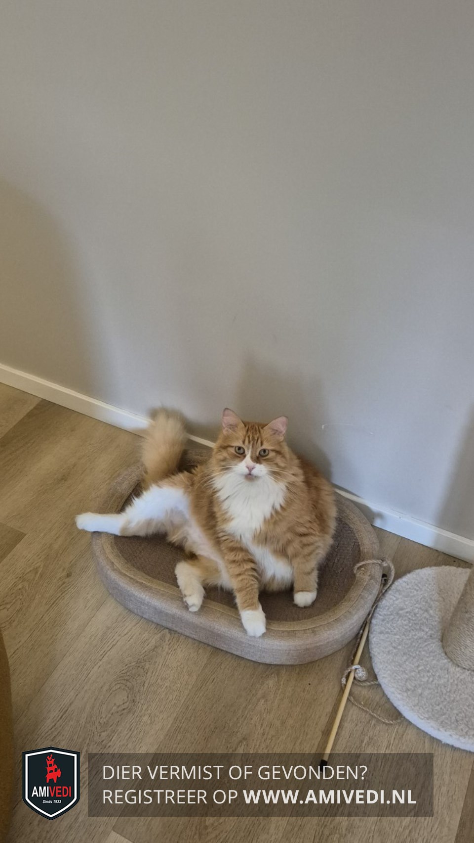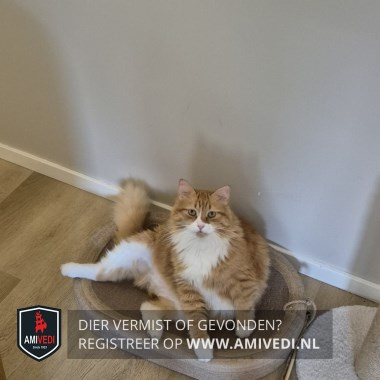 | Signalement | Rood/oranje met witte Boskat/Syberische kater, Cypers rood/oranje petje, rood/oranje naast linkerkant neusbrug, bekje bovenkant wit, witte bef, borst en buik, linkervoorpoot wit voetje, rechter voorpoot wit sokje, achterpoten ook met wit, rood/oranje pluimstaart |