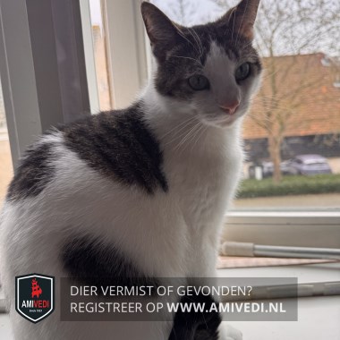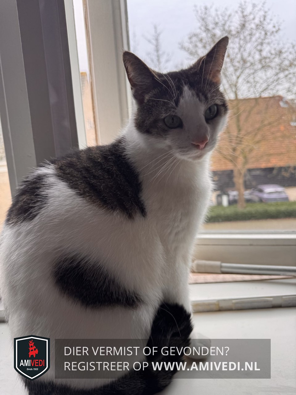 | Signalement | Wit met cypers bruin/zwart. Cypers bruin/zwart bovenop de kop, oren en zijkant kop. Wit vanaf het voorhoofd, half over beide ogen, neusbrug, rondom neus, bek en kin. Witte bef en borst, loopt wit door naar de nek. Witte buik en poten. Op de rug een grote cypers bruin/zwarte vlek en daaronder een kleinere vlek. Cypers bruin/zwarte vlek op rechter zijflank ter hoogte van rechter achterpoot. Cypers bruin/zwarte staart. Kat is redelijk groot. |