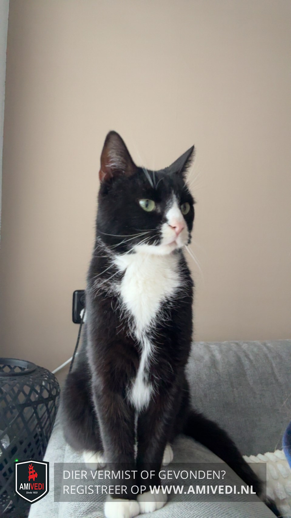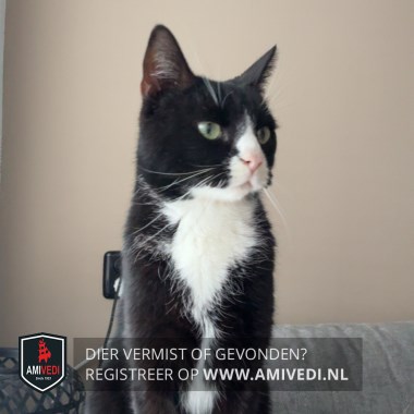 | Signalement | Zwarte kat met witte borst en bef en witte pootjes . wit in de staart. |