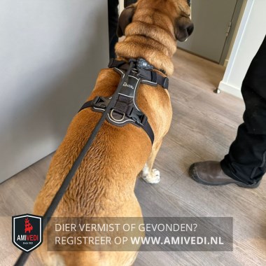 | Signalement | Beige hond met zwart-witte snoet en keel. Zwart rond de ogen. Witte tenen aan de poten. Draagt een zwart tuig. |
