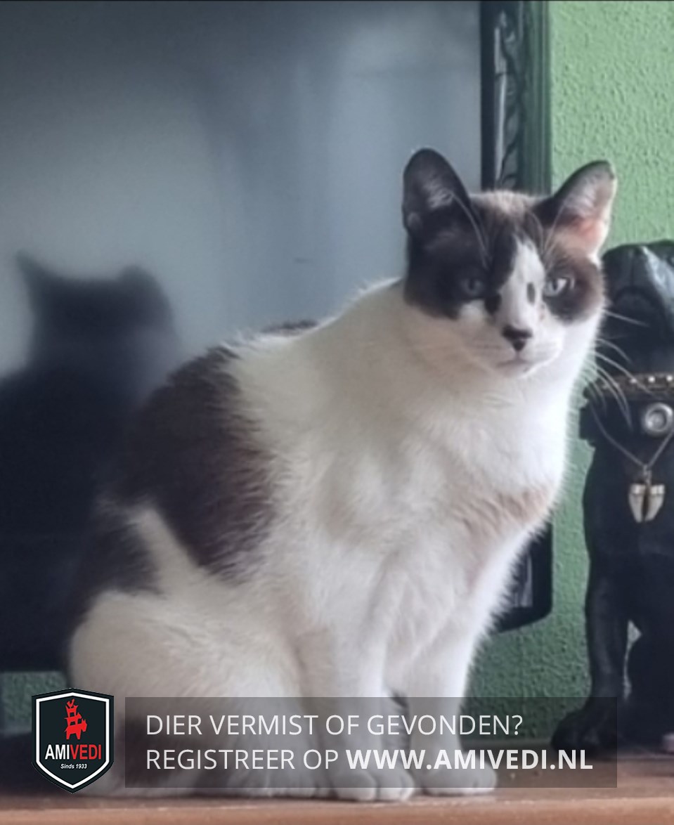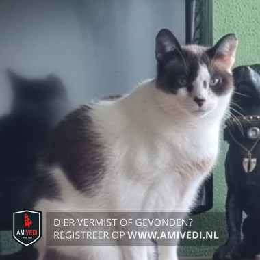 | Signalement | witte driehoek tot boven de ogen, witte hals, borst buik en pootjes. Bruin bij het linker oortje en iet op het kopje en beige vlek, rechter oor zwart en op de rug naar de zijde een zwarte vlek en zwarte staart . |