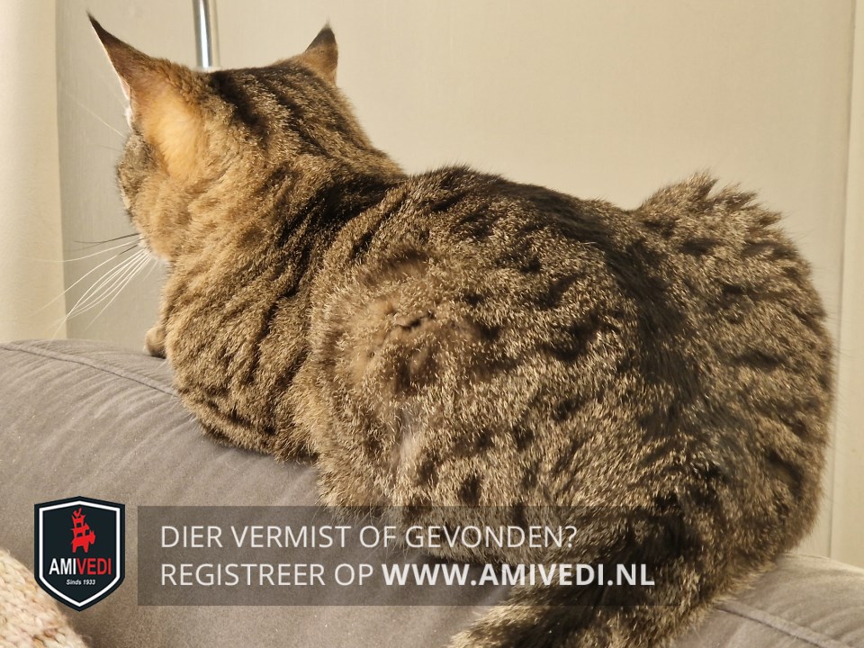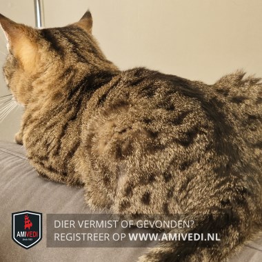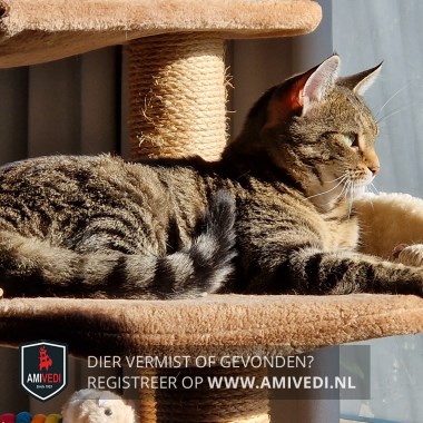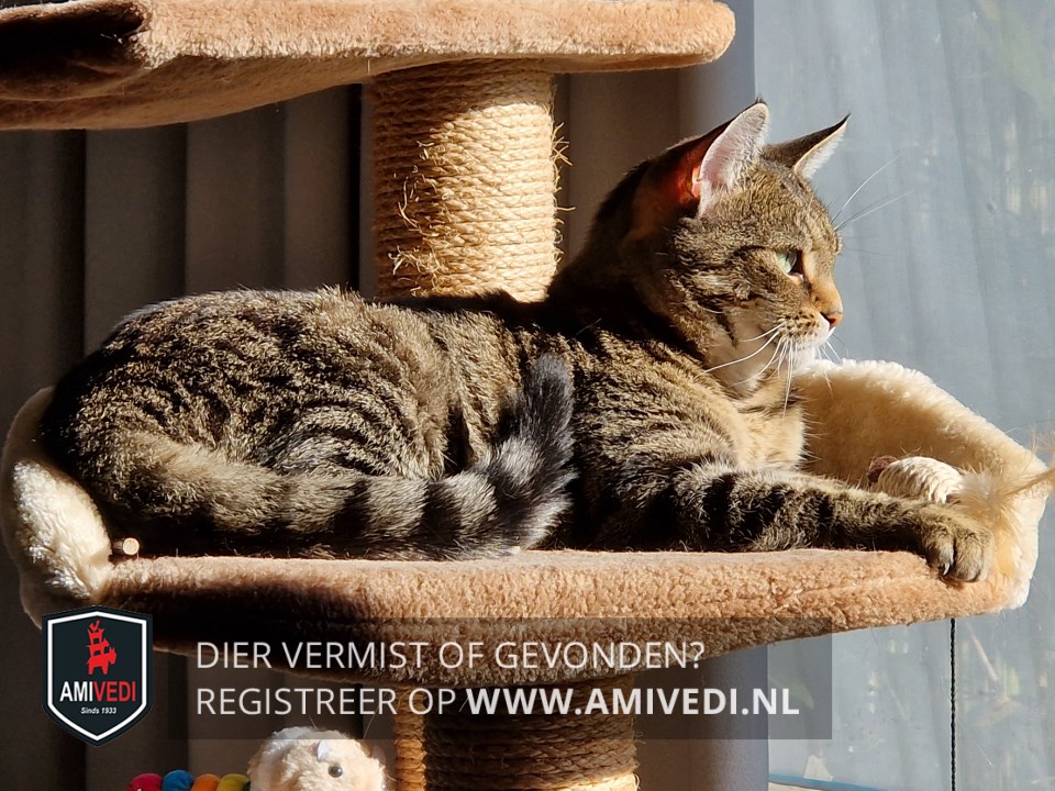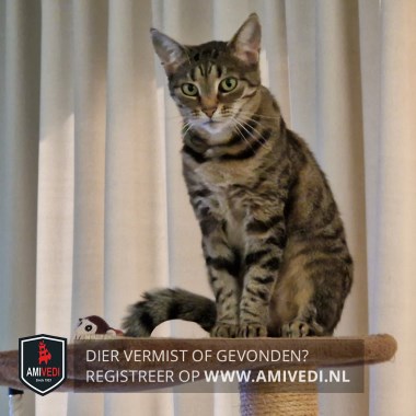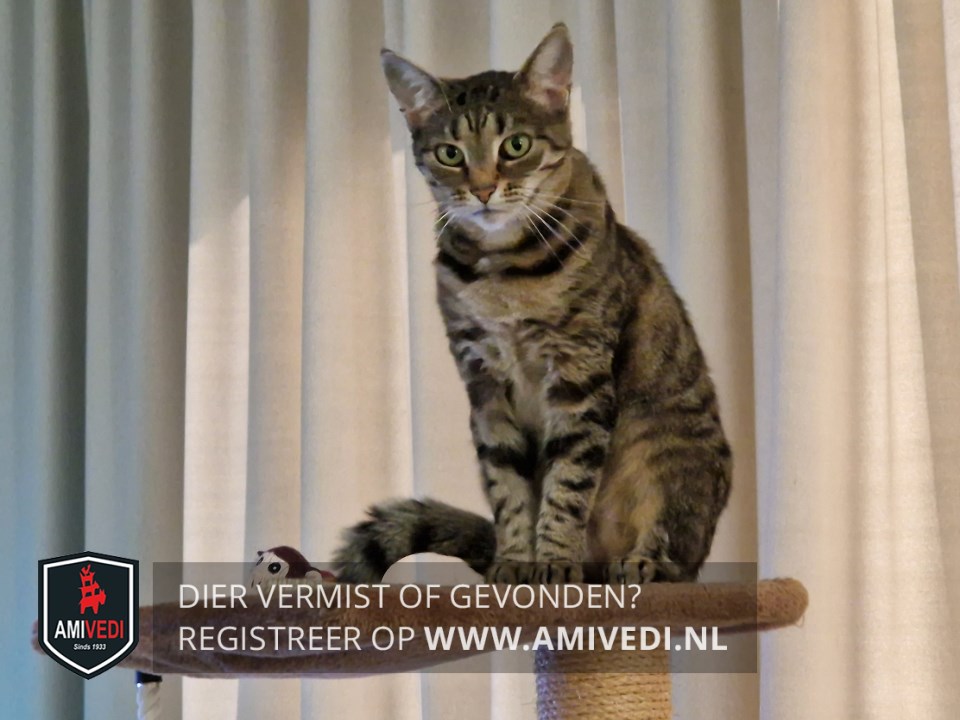 | Signalement | Cypers bruin/zwart/wit/beige gestreept, wit rondom bekje/kin/snorharen, Slanke kat. Leeft als binnen kat en is helaas ontsnapt. Ze kent het buiten dus niet en ze zal zich waarschijnlijk verstoppen onder struiken en dergelijke. Zeer schuw/angstig en zeer eenkennig. Zal vluchten als je haar benadert. Pak haar ook niet zomaar op, want ze zal proberen te vluchten en wanneer vluchten niet mogelijk is, zich gaan verdedigen. |