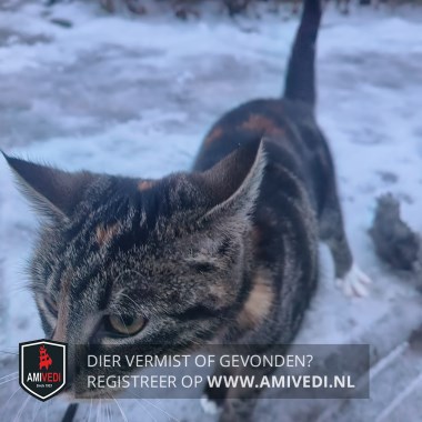 | Signalement | Cypers rood/bruin/zwart gestreept met wit. Hij heeft een bruin/rood neusje. En ook wat rode vlekken .Allemaal kleurtjes Witte tenen aan de voorpoten en in ieder geval aan het linker achterpoot iets meer wit. |
