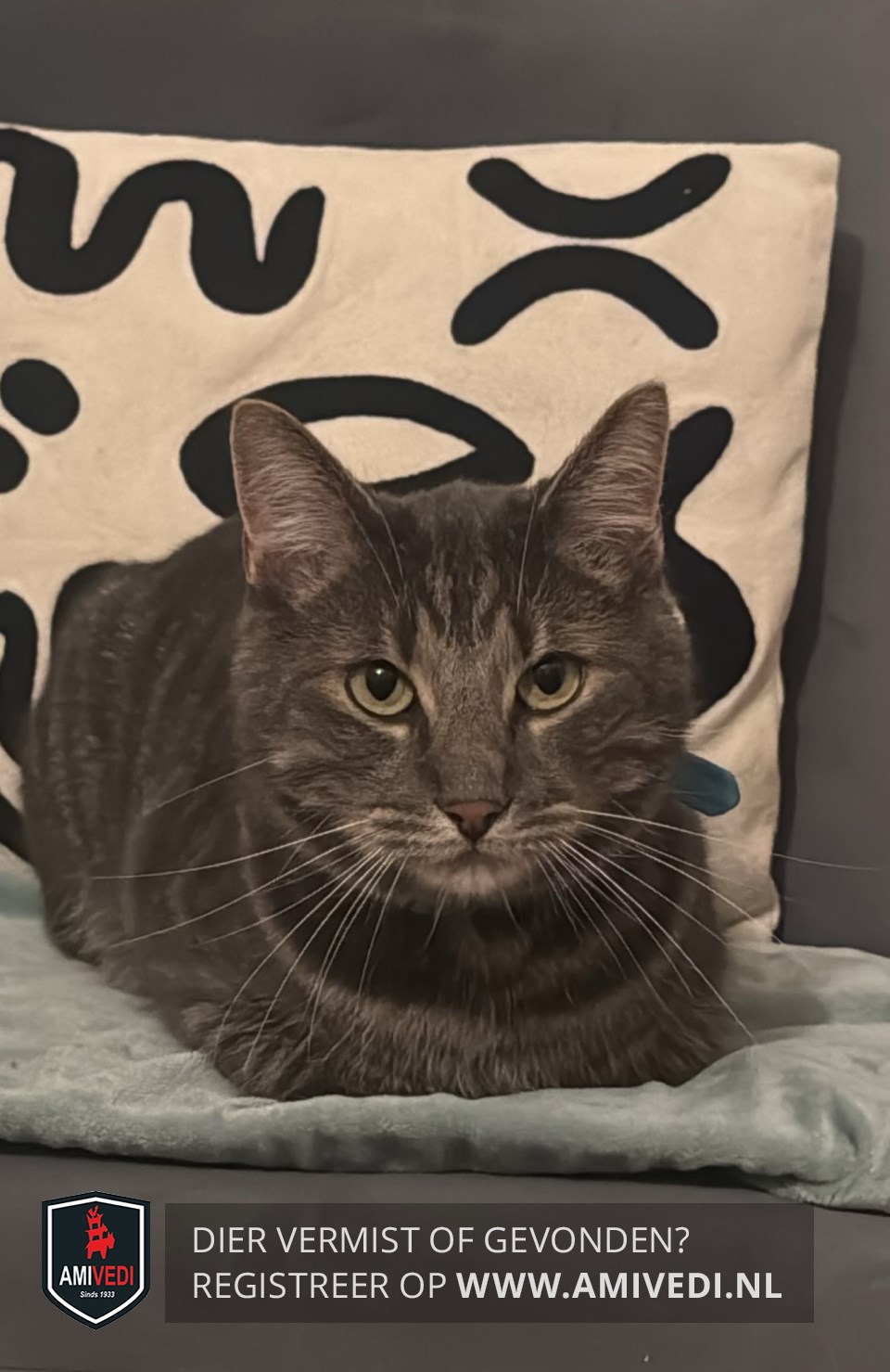 | Signalement | Cypers grijs/zwart gestreept met een paar witte accenten: wit onder de neus, witte snorharen, bij bekje en kin. |