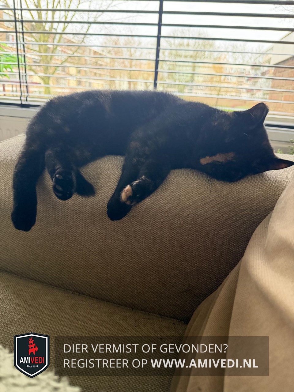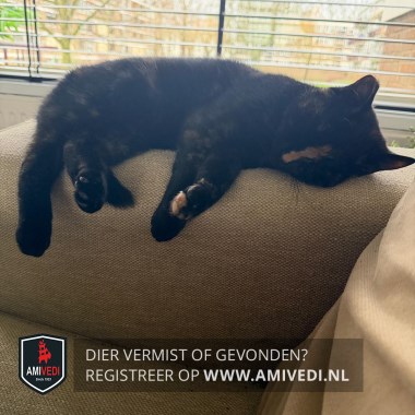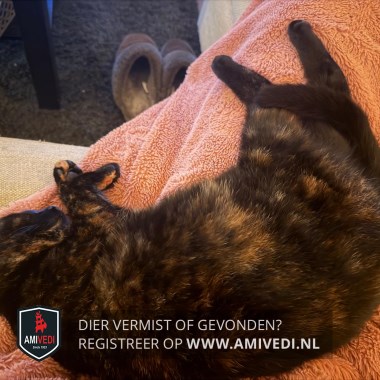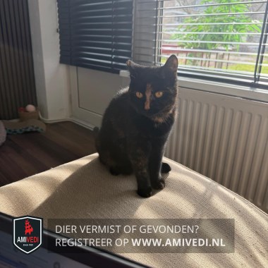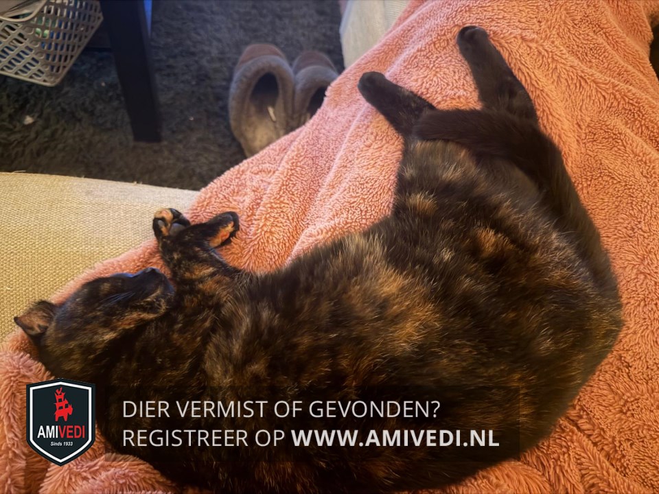| Signalement | Zwart bruine schildpad poes met een stukje uit haar rechteroortje. Bruine streep op de bles en aan het voorpootje een paar bruine teentjes. Haar vacht is zwart bruin gemêleerd. |