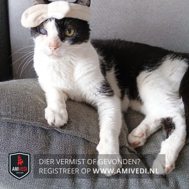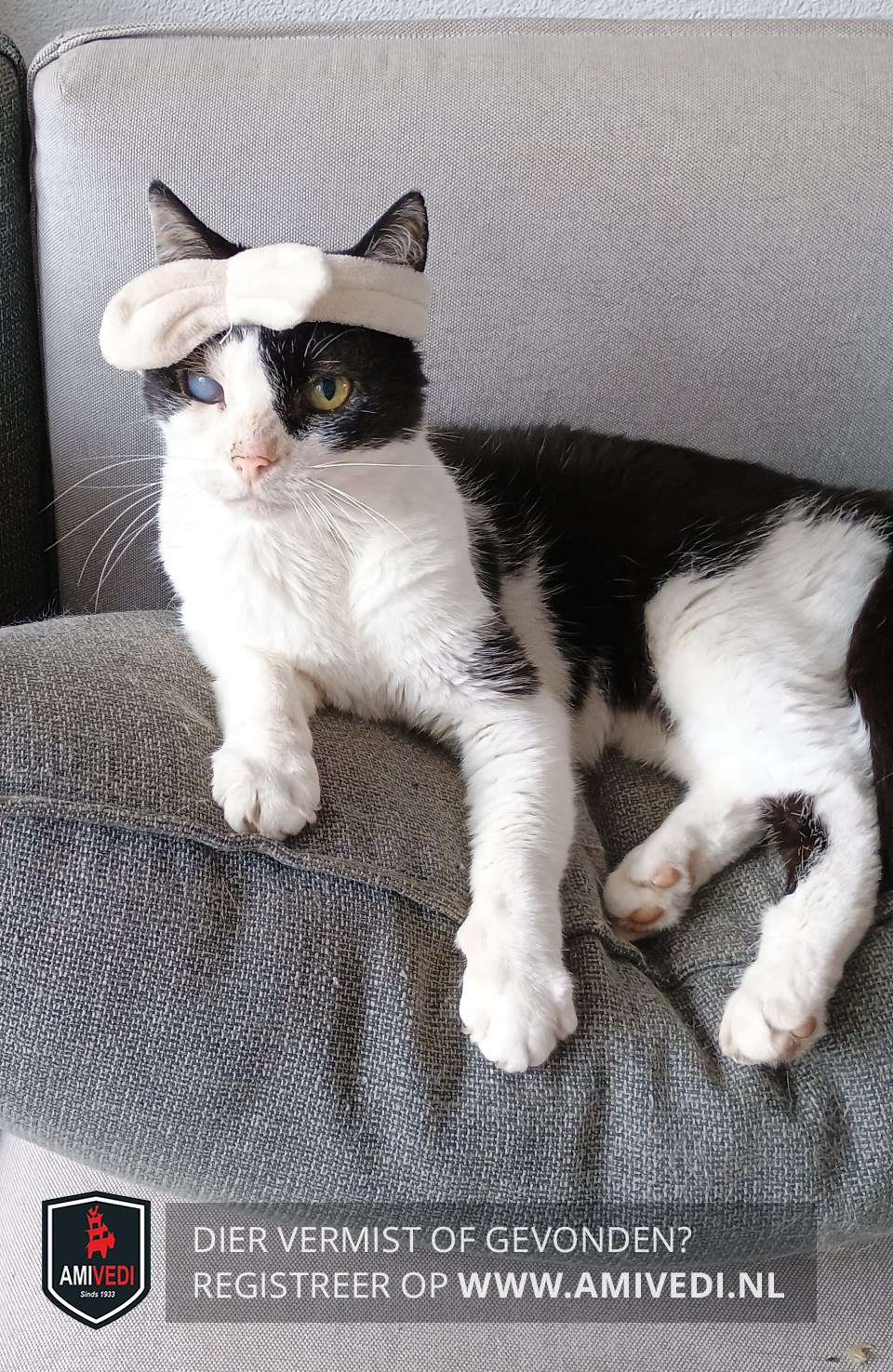 | Signalement | Zwart witte kater met rechteroog wit uitgeslagen ivm ouderdom. Goede oog is groengeel van kleur. |