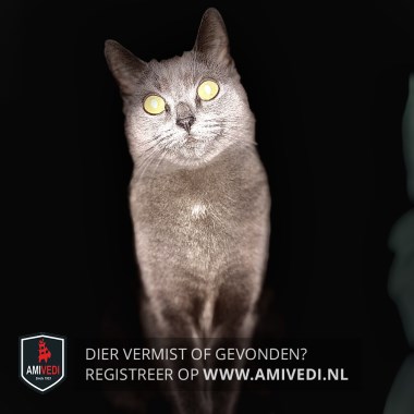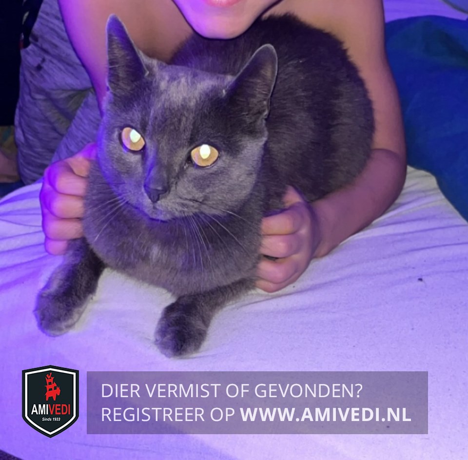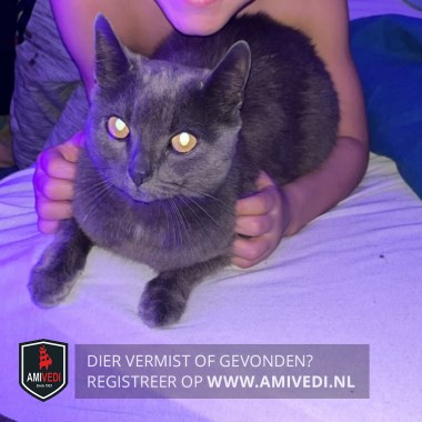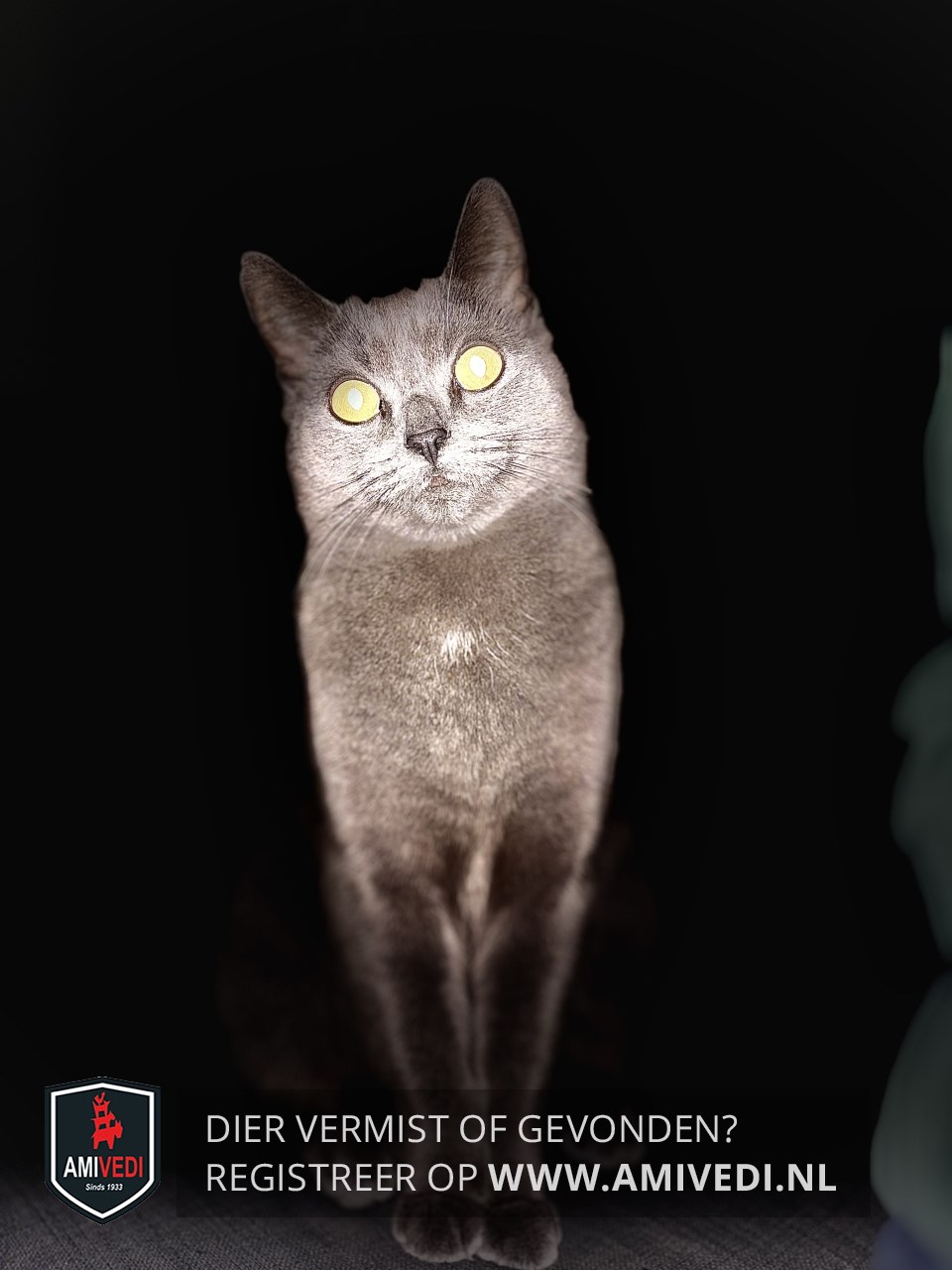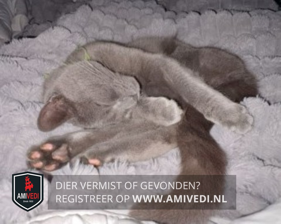 | Signalement | Grijs Brits korthaar kruising. Op de borst enkele witte haren, een klein hoekje uit een oor. Schuw. |