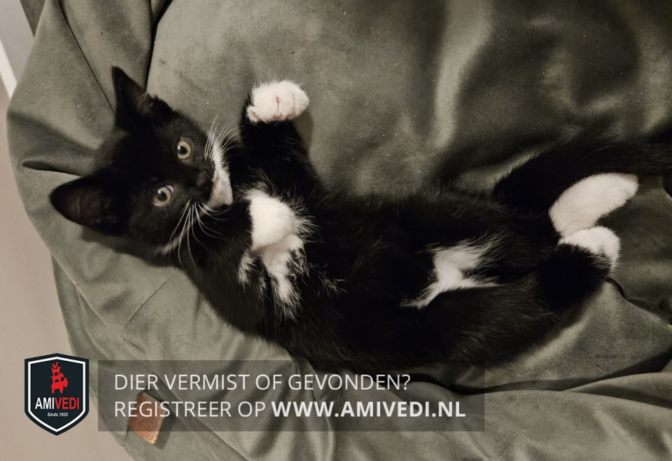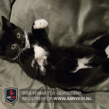 | Signalement | Zwart kitten met links witte bovenlip, witte snorharen en witte kin. Witte bef en witte vlek op buikje. Witte sokjes en links achter witte kous. Is nu groter dan op de foto |