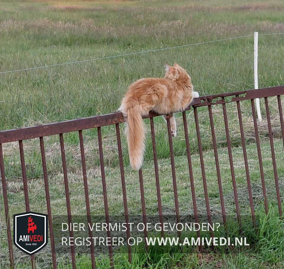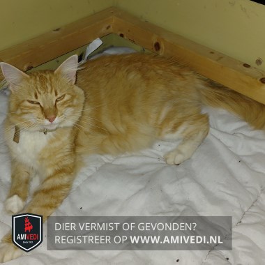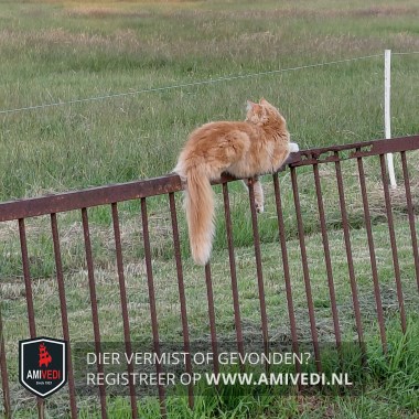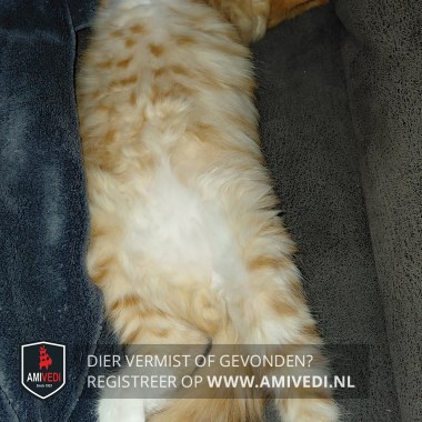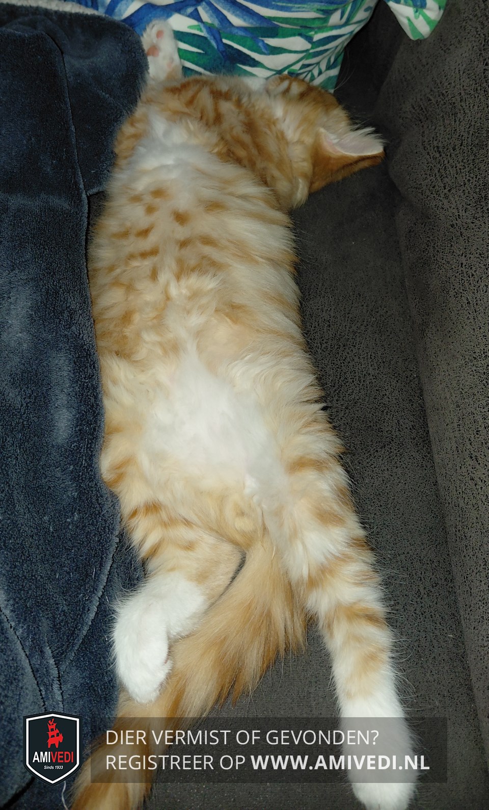 | Signalement | Cypers rood, klein wit snorretje, wit op de wangen, kin, bef, borst, lijf is cypers rood met een gemarmerd patroon, voorpoten witte voetjes, achter poot rechts een witte kous, achter poot links een wit sokje, wit op de buik tussen de voor en achter poten, rode pluimstaart. |