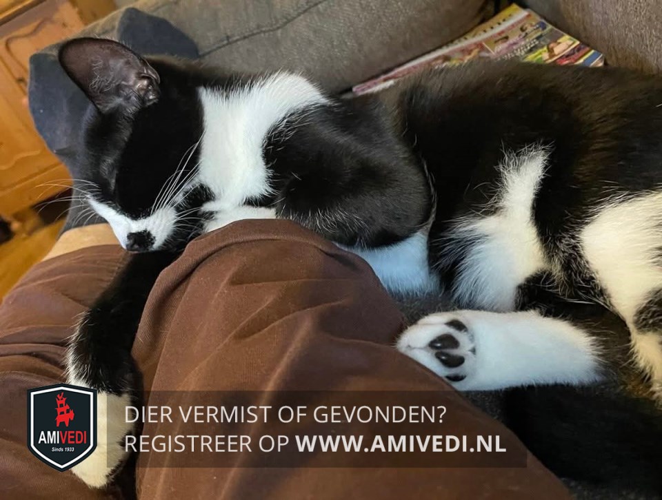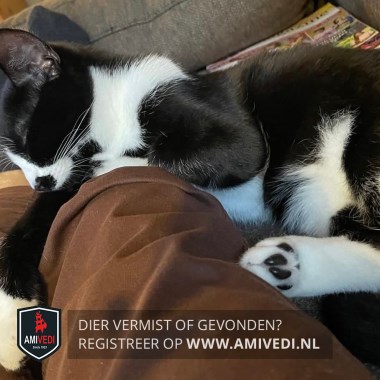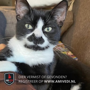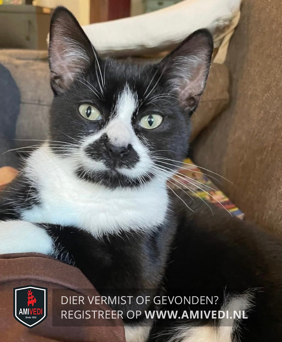 | Signalement | Slanke zwarte witte kater. Witte snuit met brede zwarte 'snor' en zwarte kin. Witte bef en witte sokjes met zwarte zooltjes. Witte vlekken op de buik. Groene ogen. |