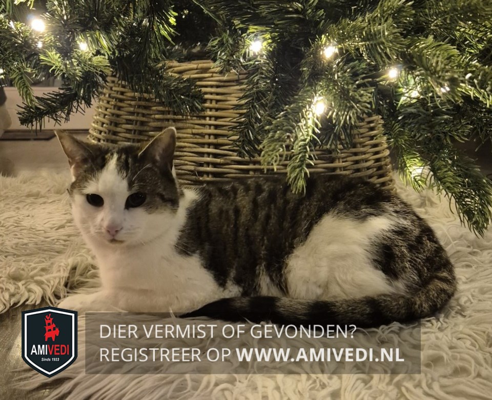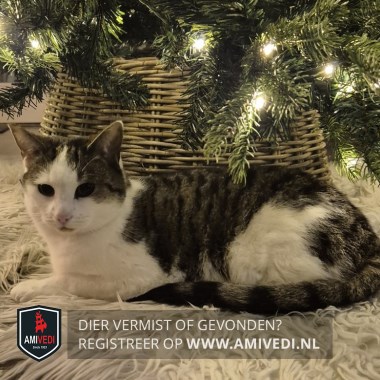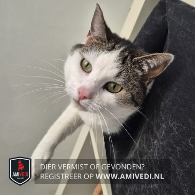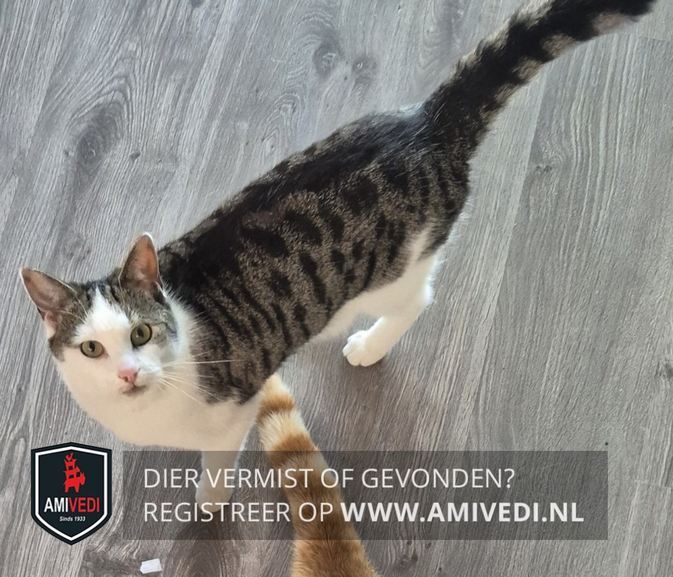 | Signalement | Europese korthaar poes, wit met grijs/bruin en zwart gestreept. Bovenkant kopje en oren grijs/bruin met zwart gestreept. Over de rug vanaf schouders grijs/bruin met zwart gestreept dekje uitlopend over de flanken en de staart. Witte snuit, witte bef, witte borst, witte buik en witte voor- en achterpoten en witte linker heup. |