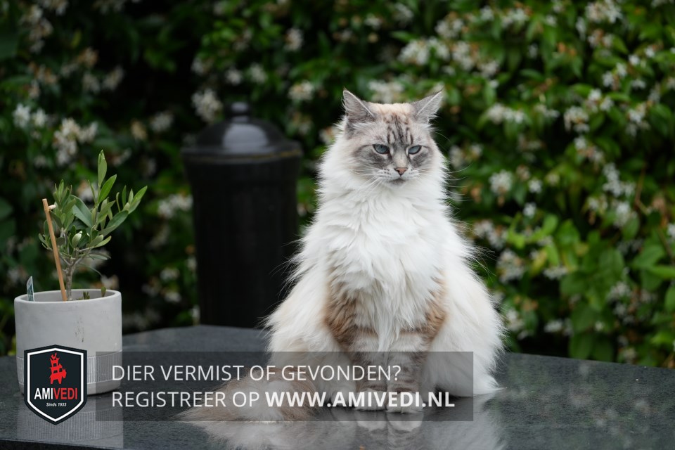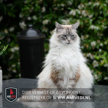 | Signalement | Blauwe ogen. Loenst een beetje Kruising boskat, snoet, oortjes beige kleurig, voorpoten beide gekleurd met een streeppatroon, witte voetjes voor, beige achterpoten met witte voetjes, beige langharige staart, lijf zelf wit. |