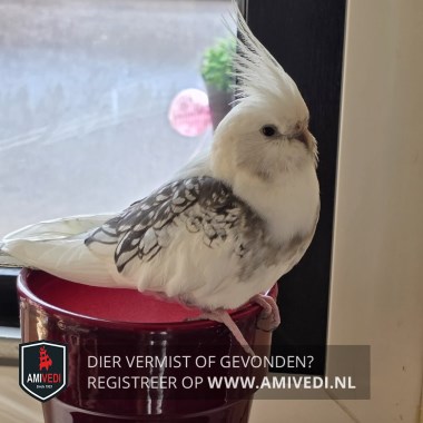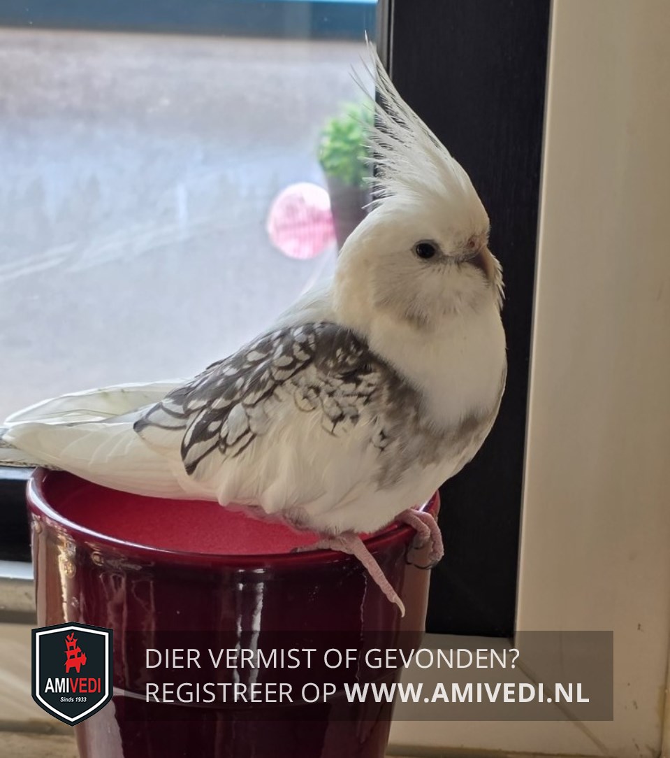 | Signalement | Veel wit kuif ook wit ,met op de vleugels grijs en zwart,zei heeft een blauw ringetje om haar pootje . |