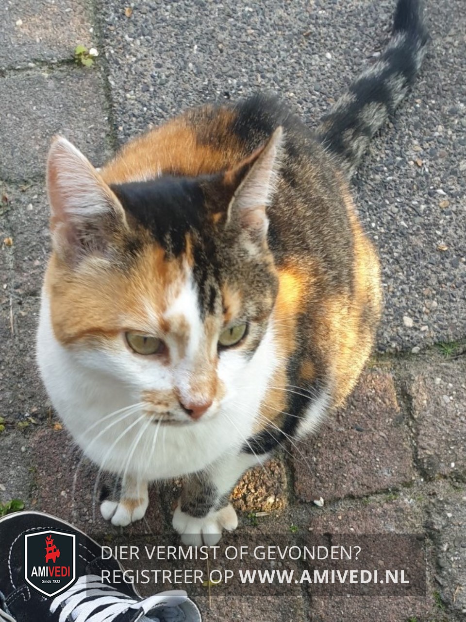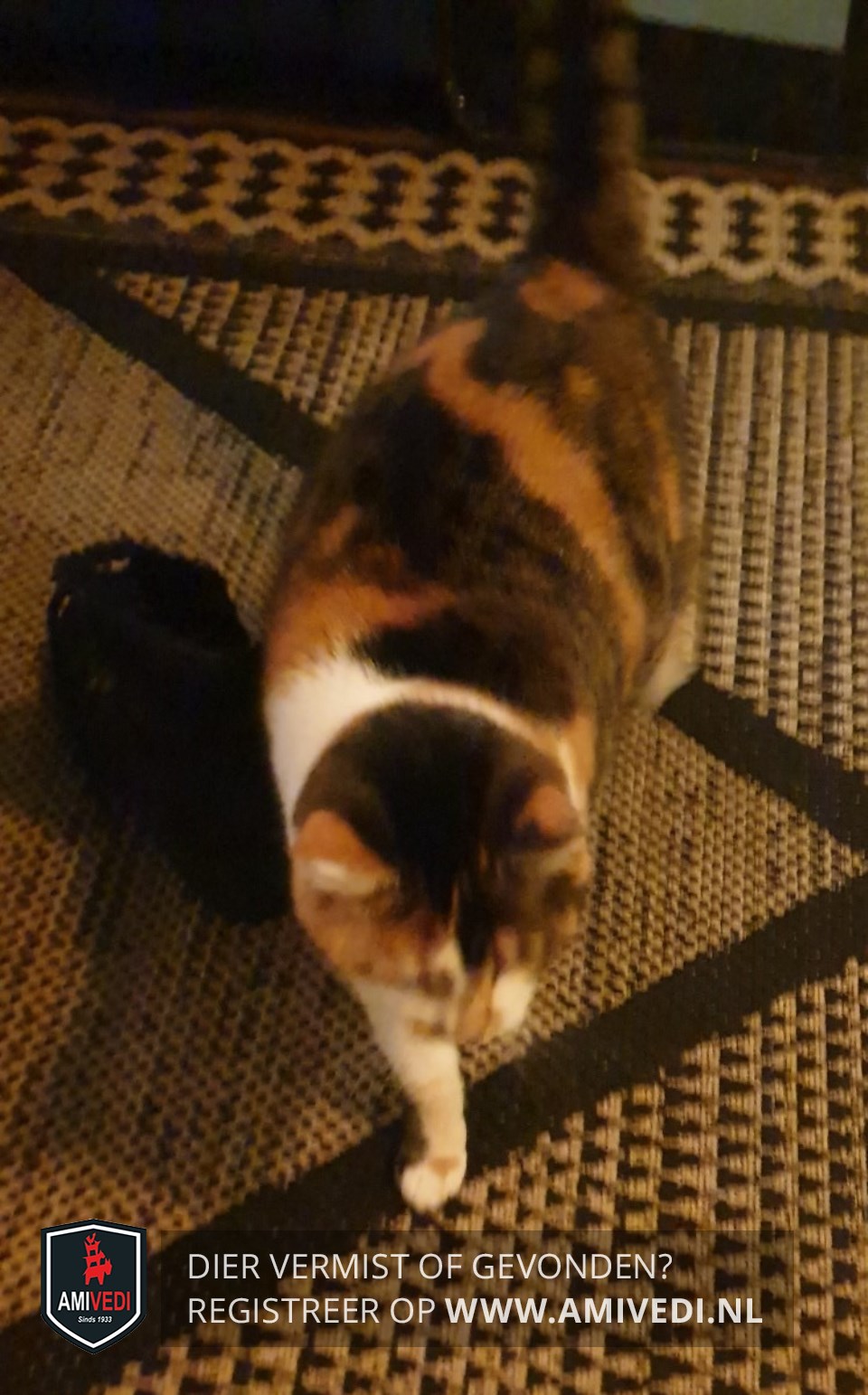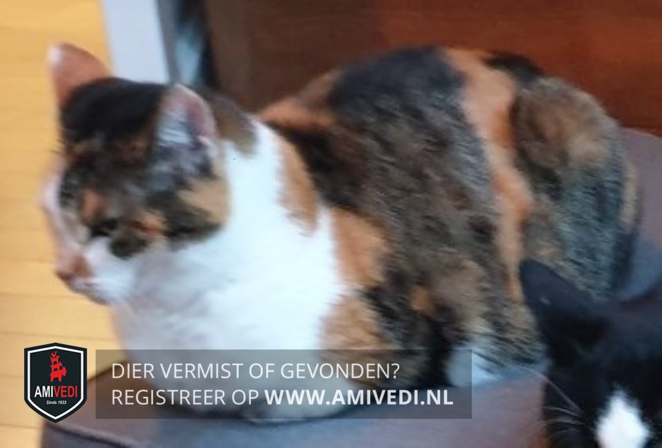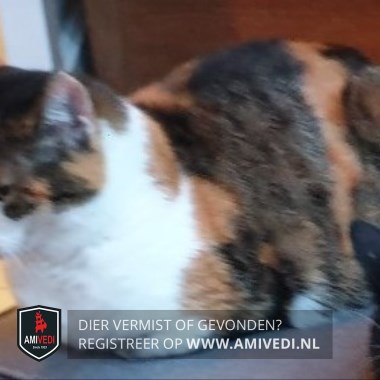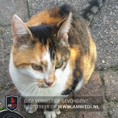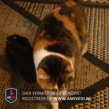 | Signalement | Rood/oranje/wit/zwart/grijs gevlekte schildpad kat. Cyperse zwart/grijze strepen op het kopje. Witte borst. Gevlekte rood/bruin/zwarte rug met vlak voor de staart een opvallende oranje/bruine vlek en een cyperse zwart/grijze staart. |