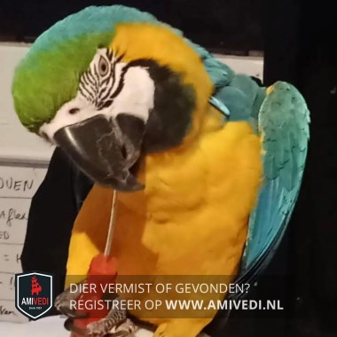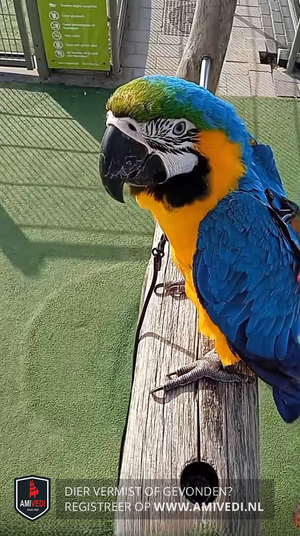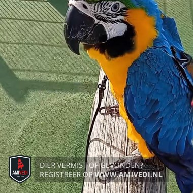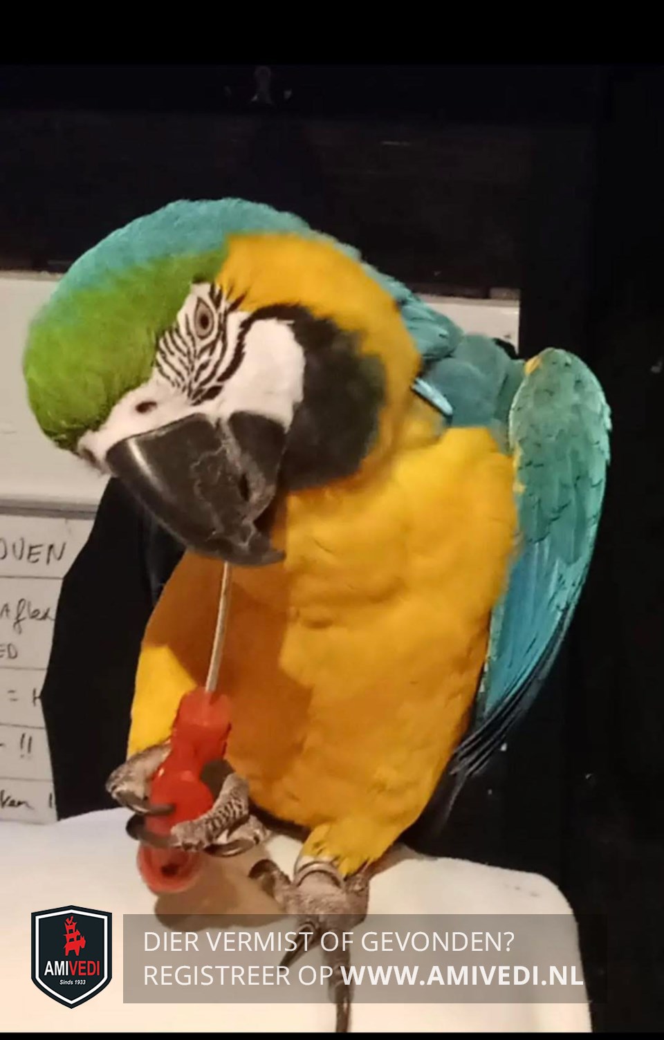 | Signalement | Jonge blauwgele ara; reageert op 'Hallo' en 'Nootje' |