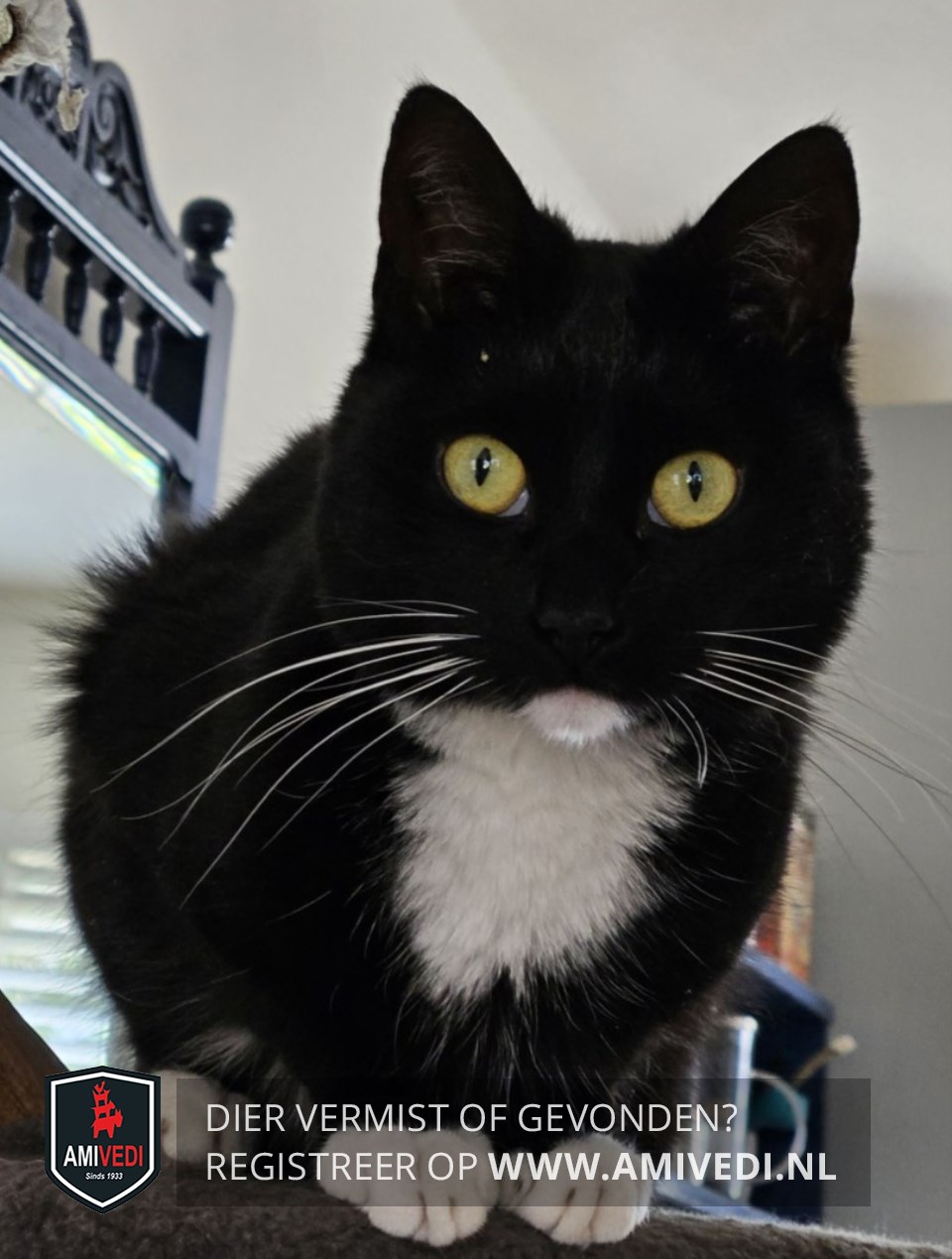 | Signalement | Zwart wit: over het algemeen gehhel zwart met wit kinnetje, wit befje, witte voetjes en witte snorharen. Gele ogen. |