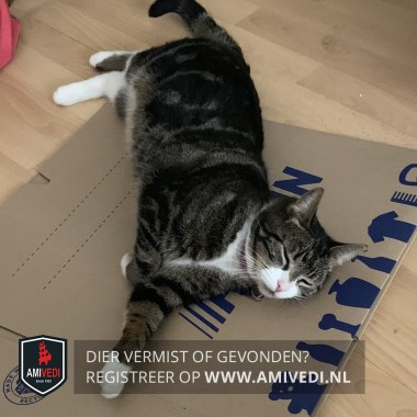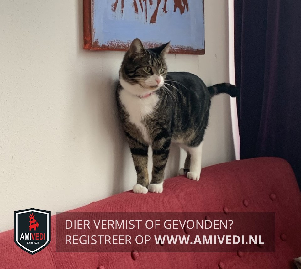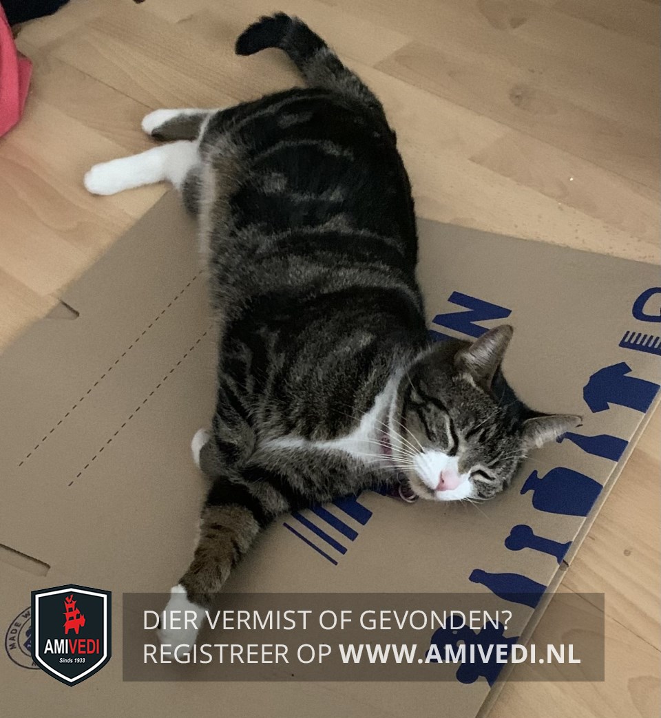 | Signalement | Cypers bruingrijs/zwart gestreept met duidelijke witte accenten. Klein beetje wit boven de roze neus, witte snoet, kin is wit met wat bruin, brede witte bef, borst, witte voetjes aan de voorpoten, witte laars aan de linkerachterpoot, wit voetje aan de rechterachterpoot. Cypers gestreept op de kop, meer donker gemarmerd op het lijfje, de voorpoten zijn meer bruin met bovenaan een paar zwarte strepen. |