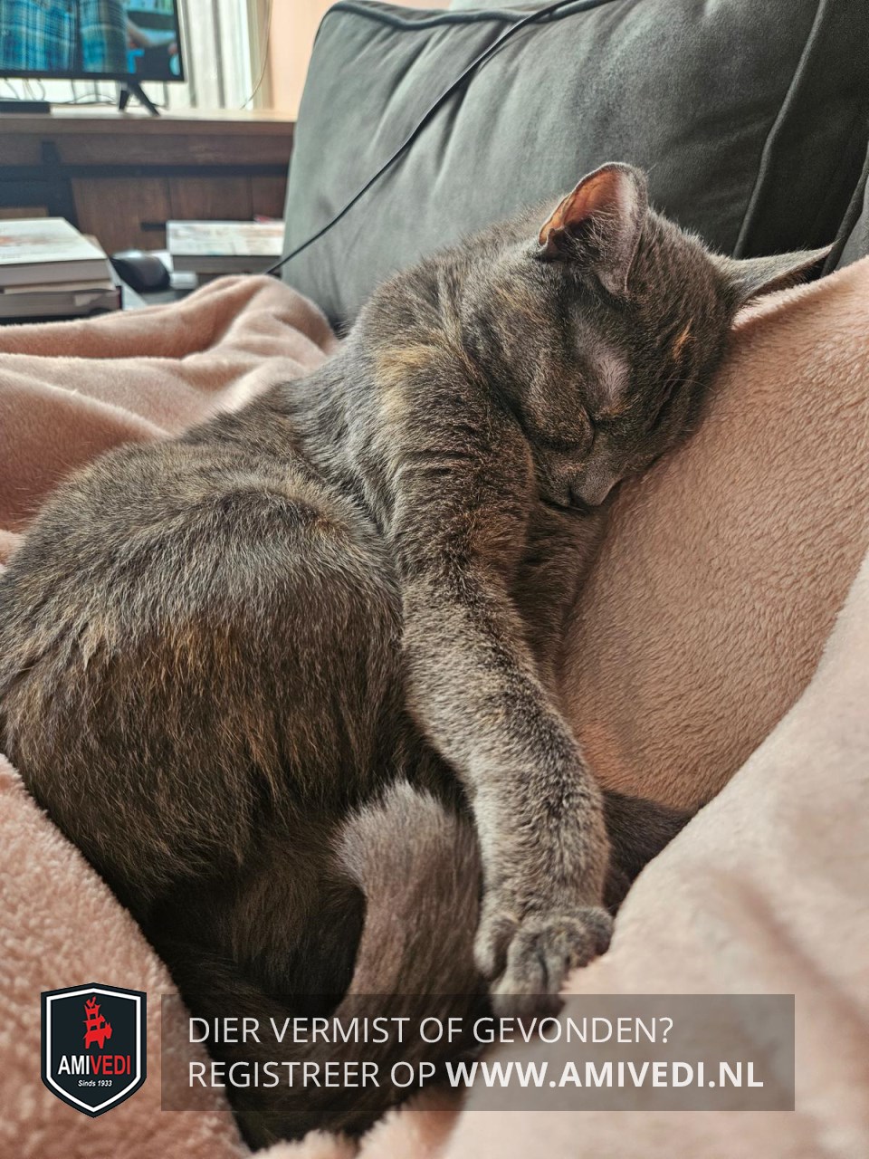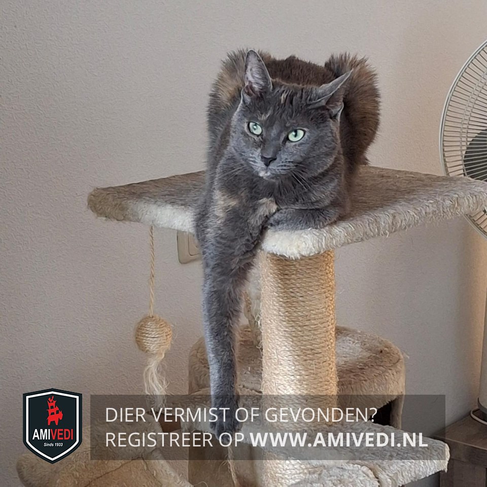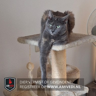 | Signalement | Grijze kat met hier en daar wat crème-beige kleur. Grijze kop met beige streepje op kop tussen de oren. Traanoog links. |