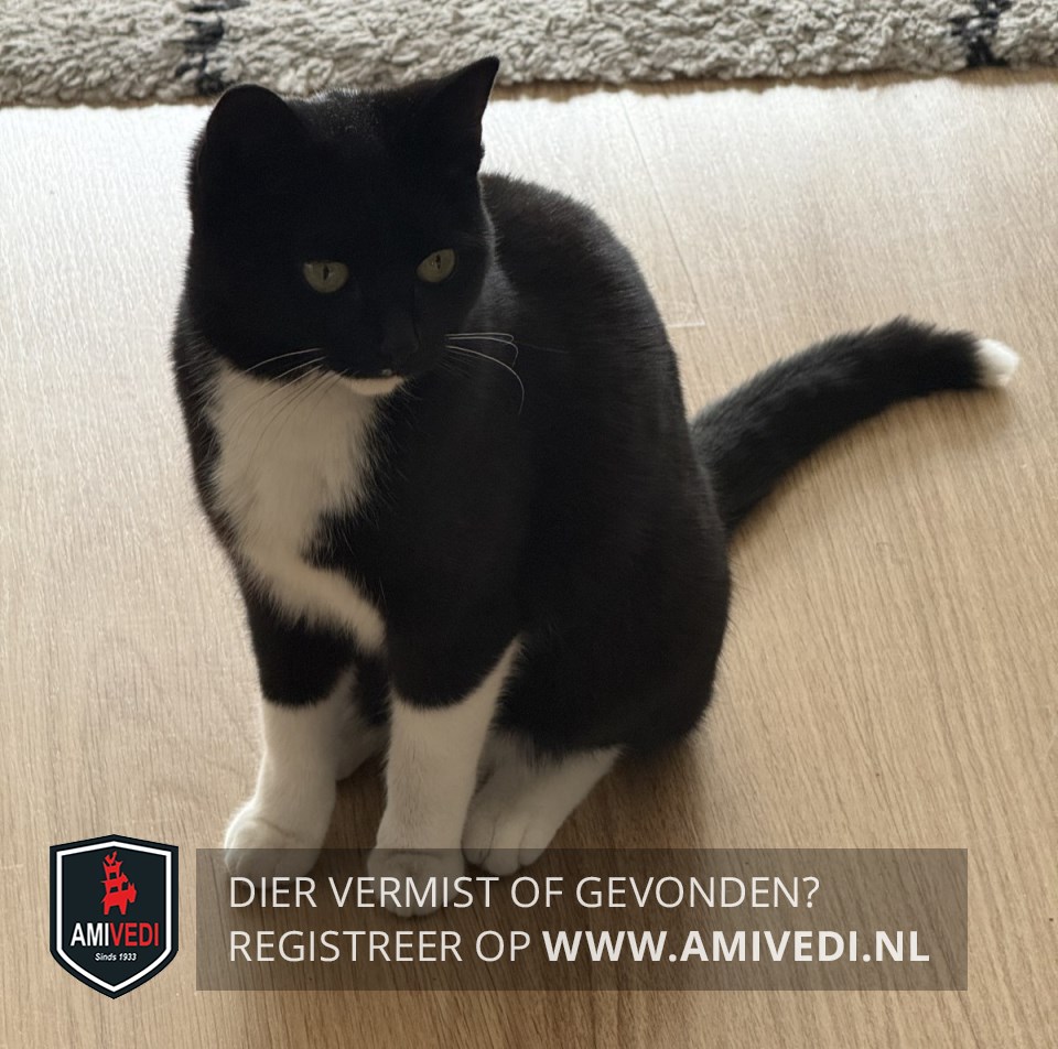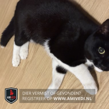 | Signalement | Egaal zwarte kater/ poes met een zwart kopje en een witte kin, zwart lijfje met een witte borst en een witte onderkant. 4 witte pootjes met een zwarte staart waaraan een wit puntje zit. |
